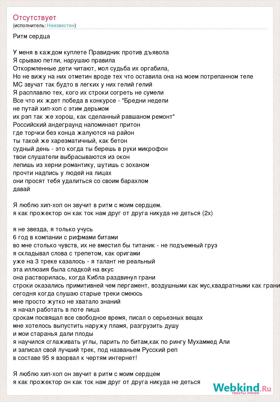 Ритм сердца У меня в каждом куплете Правидник против дъявола Я срываю петли, нарушаю правила Откормленные дети читают, мол судьба их оргабила, Но не вижу на них отметин вроде тех что оставила она на моем потрепанном теле МС звучат так будто в легких у них гелий гелий Я расплавлю тех, кого их строки согреть не сумели Все что их ждет победа в конкурсе - "Бредни недели не путай хип-хоп с этим дерьмом их рэп так же хорош, как сделанный равшаном ремонт" Российский андеграунд напоминает притон где торчки без конца жалуются на район ты такой же харезматичный, как бетон судный день - это когда ты берешь в руки микрофон твои слушатели выбрасываются из окон лепишь из херни романтику, шутишь с зоханом прочти надпись у людей на лицах они просят тебя удалиться со своим барахлом давай Я люблю хип-хоп он звучит в ритм с моим сердцем. я как прожектор он как ток нам друг от друга никуда не деться (2х) я не звезда, я только учусь 6 год в компании с рифмами битами во мне столько чувств, их не вместил бы титаник - не подъемный груз я складывал слова с трепетом, как оригами уже на 3 треке казалось - я талант не реальный эта иллюзия была сладкой на вкус она растворилась, когда Кибла раздвинул грани строки оказались примитивней чем пергамент, воздушными как мус,квадратными как грани сегодня когда слушаю старые треки смеюсь мне просто жутко не хватало знаний я начал работать в поте лица срокам посвящал все свободное время, писал о серьезных вещах мне хотелось выпустить наружу пламя, разгрузить душу и мои старанья дали плоды я научился сглаживать углы, парить по битам,как по рингу Мухаммед Али и записал свой лучший трек, под названьем Русский реп в составе 95 я взорвал к чертям интернет! Я люблю хип-хоп он звучит в ритм с моим сердцем я как прожектор он как ток нам друг от друга никуда не деться