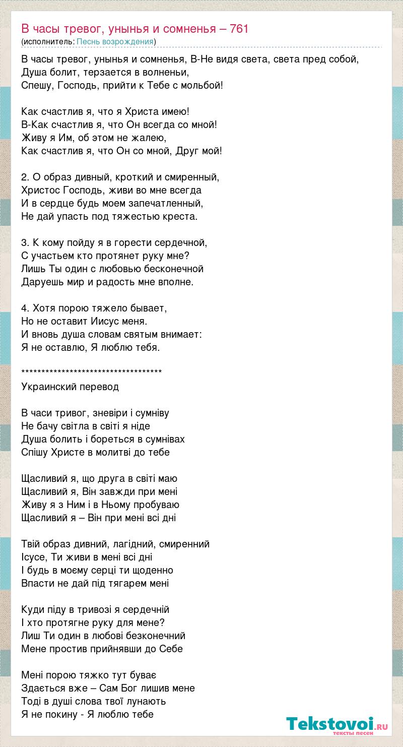 В часы тревог, унынья и сомненья, B-Не видя света, света пред собой, Душа болит, терзается в волненьи, Спешу, Господь, прийти к Тебе с мольбой! Как счастлив я, что я Христа имею! B-Как счастлив я, что Он всегда со мной! Живу я Им, об этом не жалею, Как счастлив я, что Он со мной, Друг мой! 2. О образ дивный, кроткий и смиренный, Христос Господь, живи во мне всегда И в сердце будь моем запечатленный, Не дай упасть под тяжестью креста. 3. К кому пойду я в горести сердечной, С участьем кто протянет руку мне? Лишь Ты один с любовью бесконечной Даруешь мир и радость мне вполне. 4. Хотя порою тяжело бывает, Но не оставит Иисус меня. И вновь душа словам святым внимает: Я не оставлю, Я люблю тебя. *********************************** Украинский перевод В часи тривог, зневіри і сумніву Не бачу світла в світі я ніде Душа болить і бореться в сумнівах Спішу Христе в молитві до тебе Щасливий я, що друга в світі маю Щасливий я, Він завжди при мені Живу я з Ним і в Ньому пробуваю Щасливий я – Він при мені всі дні Твій образ дивний, лагідний, смиренний Ісусе, Ти живи в мені всі дні І будь в моєму серці ти щоденно Впасти не дай під тягарем мені Куди піду в тривозі я сердечній І хто протягне руку для мене? Лиш Ти один в любові безконечний Мене простив прийнявши до Себе Мені порою тяжко тут буває Здається вже – Сам Бог лишив мене Тоді в душі слова твої лунають Я не покину - Я люблю тебе
