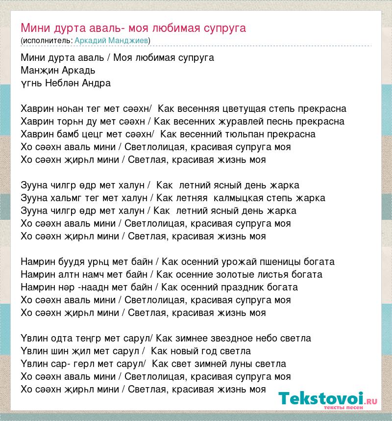 Мини дурта аваль / Моя любимая супруга Манҗин Аркадь үгнь Неблән Андра Хаврин ноһан тег мет сәәхн/ Как весенняя цветущая степь прекрасна Хаврин торһн ду мет сәәхн / Как весенних журавлей песнь прекрасна Хаврин бамб цецг мет сәәхн/ Как весенний тюльпан прекрасна Хо сәәхн аваль мини / Светлолицая, красивая супруга моя Хо сәәхн җирһл мини / Светлая, красивая жизнь моя Зууна чилгр өдр мет халун / Как летний ясный день жарка Зууна хальмг тег мет халун / Как летняя калмыцкая степь жарка Зууна чилгр өдр мет халун / Как летний ясный день жарка Хо сәәхн аваль мини / Светлолицая, красивая супруга моя Хо сәәхн җирһл мини / Светлая, красивая жизнь моя Намрин буудя урһц мет байн / Как осенний урожай пшеницы богата Намрин алтн намч мет байн / Как осенние золотые листья богата Намрин нәр -наадн мет байн / Как осенний праздник богата Хо сәәхн аваль мини / Светлолицая, красивая супруга моя Хо сәәхн җирһл мини / Светлая, красивая жизнь моя Үвлин одта теңгр мет сарул/ Как зимнее звездное небо светла Үвлин шин җил мет сарул / Как новый год светла Үвлин сар- герл мет сарул/ Как свет зимней луны светла Хо сәәхн аваль мини / Светлолицая, красивая супруга моя Хо сәәхн җирһл мини / Светлая, красивая жизнь моя