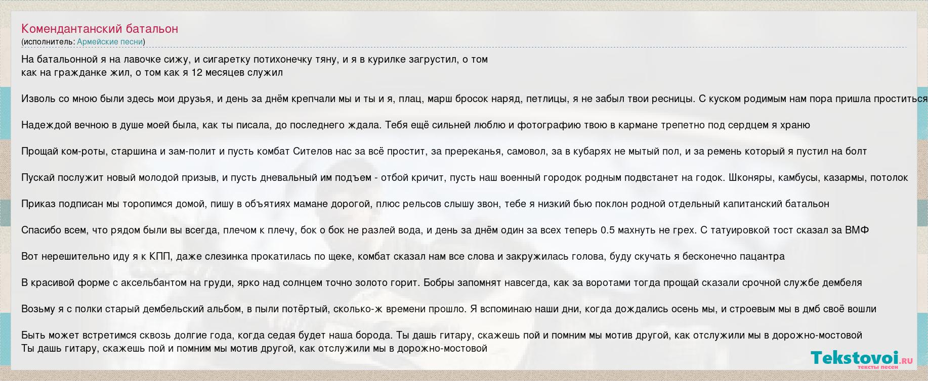 На батальонной я на лавочке сижу, и сигаретку потихонечку тяну, и я в курилке загрустил, о том как на гражданке жил, о том как я 12 месяцев служил Изволь со мною были здесь мои друзья, и день за днём крепчали мы и ты и я, плац, марш бросок наряд, петлицы, я не забыл твои ресницы. С куском родимым нам пора пришла проститься Надеждой вечною в душе моей была, как ты писала, до последнего ждала. Тебя ещё сильней люблю и фотографию твою в кармане трепетно под сердцем я храню Прощай ком-роты, старшина и зам-полит и пусть комбат Сителов нас за всё простит, за пререканья, самовол, за в кубарях не мытый пол, и за ремень который я пустил на болт Пускай послужит новый молодой призыв, и пусть дневальный им подъем - отбой кричит, пусть наш военный городок родным подвстанет на годок. Шконяры, камбусы, казармы, потолок Приказ подписан мы торопимся домой, пишу в объятиях мамане дорогой, плюс рельсов слышу звон, тебе я низкий бью поклон родной отдельный капитанский батальон Спасибо всем, что рядом были вы всегда, плечом к плечу, бок о бок не разлей вода, и день за днём один за всех теперь 0.5 махнуть не грех. С татуировкой тост сказал за ВМФ Вот нерешительно иду я к КПП, даже слезинка прокатилась по щеке, комбат сказал нам все слова и закружилась голова, буду скучать я бесконечно пацантра В красивой форме с аксельбантом на груди, ярко над солнцем точно золото горит. Бобры запомнят навсегда, как за воротами тогда прощай сказали срочной службе дембеля Возьму я с полки старый дембельский альбом, в пыли потёртый, сколько-ж времени прошло. Я вспоминаю наши дни, когда дождались осень мы, и строевым мы в дмб своё вошли Быть может встретимся сквозь долгие года, когда седая будет наша борода. Ты дашь гитару, скажешь пой и помним мы мотив другой, как отслужили мы в дорожно-мостовой Ты дашь гитару, скажешь пой и помним мы мотив другой, как отслужили мы в дорожно-мостовой