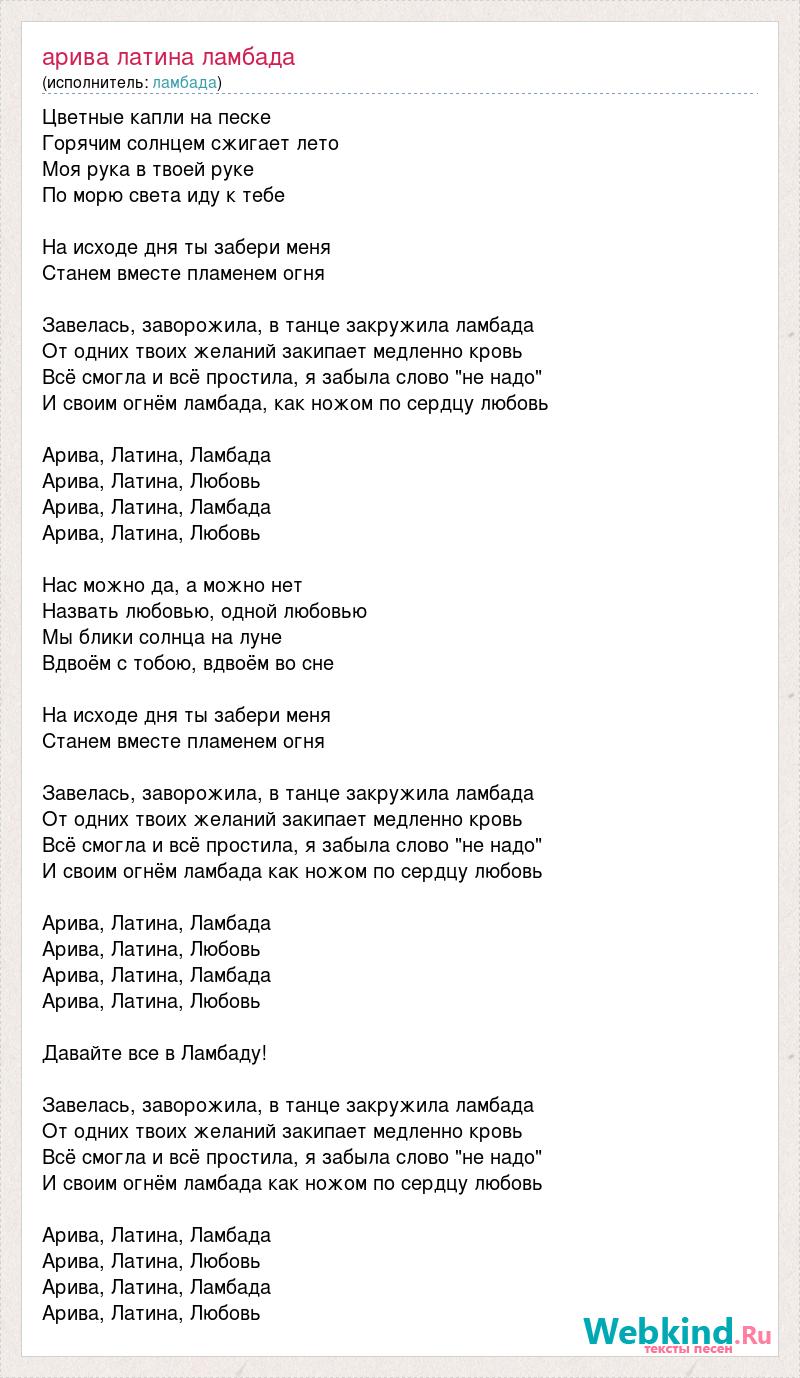 Цветные капли на песке Горячим солнцем сжигает лето Моя рука в твоей руке По морю света иду к тебе На исходе дня ты забери меня Станем вместе пламенем огня Завелась, заворожила, в танце закружила ламбада От одних твоих желаний закипает медленно кровь Всё смогла и всё простила, я забыла слово "не надо" И своим огнём ламбада, как ножом по сердцу любовь Арива, Латина, Ламбада Арива, Латина, Любовь Арива, Латина, Ламбада Арива, Латина, Любовь Нас можно да, а можно нет Назвать любовью, одной любовью Мы блики солнца на луне Вдвоём с тобою, вдвоём во сне На исходе дня ты забери меня Станем вместе пламенем огня Завелась, заворожила, в танце закружила ламбада От одних твоих желаний закипает медленно кровь Всё смогла и всё простила, я забыла слово "не надо" И своим огнём ламбада как ножом по сердцу любовь Арива, Латина, Ламбада Арива, Латина, Любовь Арива, Латина, Ламбада Арива, Латина, Любовь Давайте все в Ламбаду! Завелась, заворожила, в танце закружила ламбада От одних твоих желаний закипает медленно кровь Всё смогла и всё простила, я забыла слово "не надо" И своим огнём ламбада как ножом по сердцу любовь Арива, Латина, Ламбада Арива, Латина, Любовь Арива, Латина, Ламбада Арива, Латина, Любовь