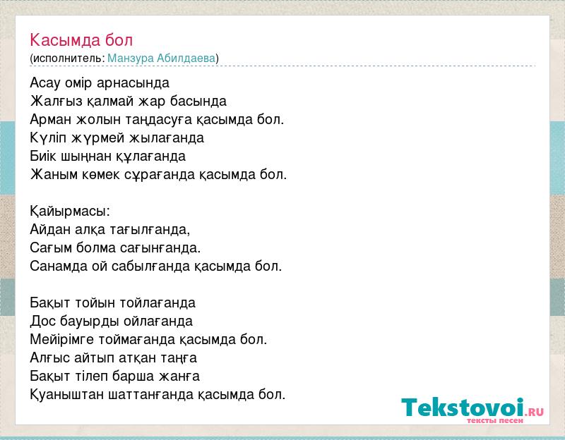 Асау омір арнасында Жалғыз қалмай жар басында Арман жолын таңдасуға қасымда бол. Күліп жүрмей жылағанда Биік шыңнан құлағанда Жаным көмек сұрағанда қасымда бол. Қайырмасы: Айдан алқа тағылғанда, Сағым болма сағынғанда. Санамда ой сабылғанда қасымда бол. Бақыт тойын тойлағанда Дос бауырды ойлағанда Мейірімге тоймағанда қасымда бол. Алғыс айтып атқан таңға Бақыт тілеп барша жанға Қуаныштан шаттанғанда қасымда бол.