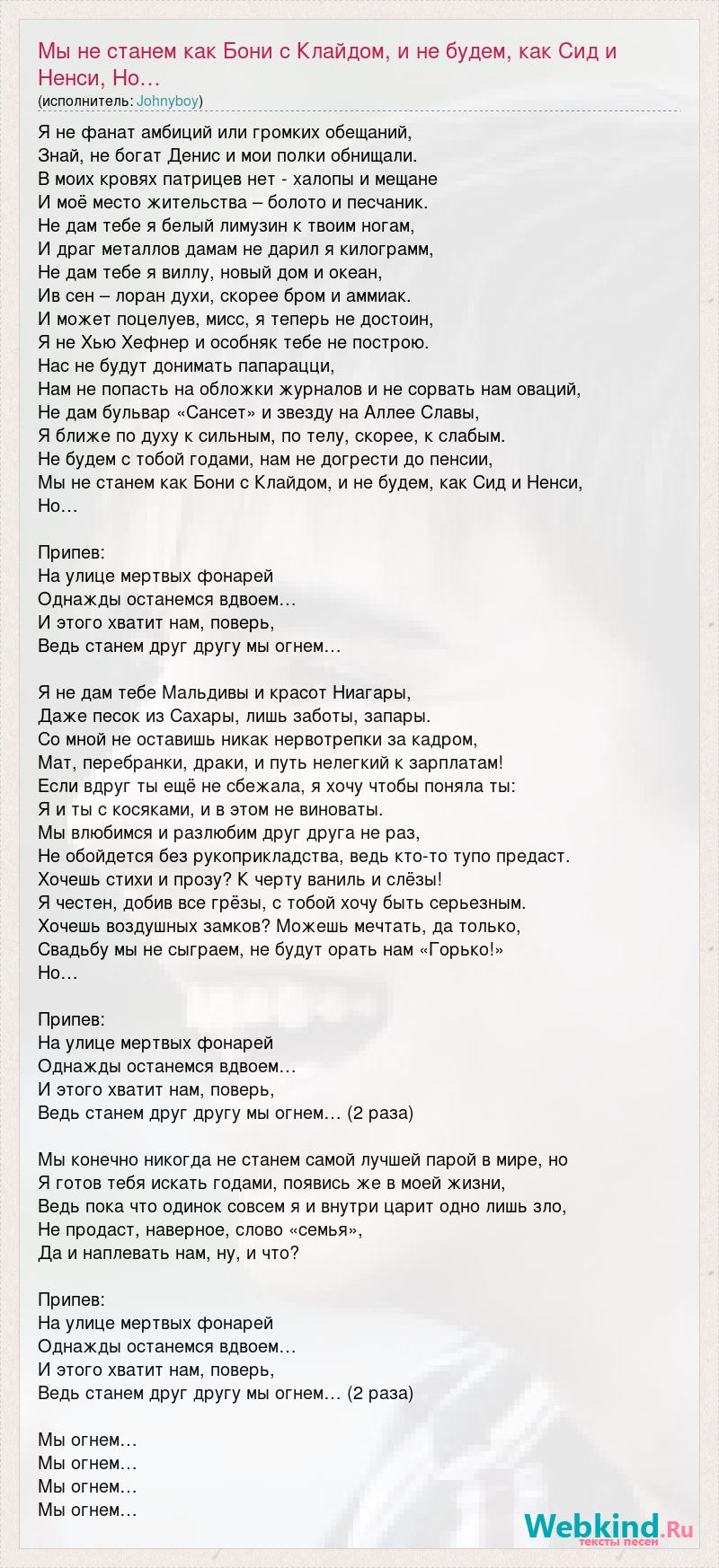 Я не фанат амбиций или громких обещаний, Знай, не богат Денис и мои полки обнищали. В моих кровях патрицев нет - халопы и мещане И моё место жительства – болото и песчаник. Не дам тебе я белый лимузин к твоим ногам, И драг металлов дамам не дарил я килограмм, Не дам тебе я виллу, новый дом и океан, Ив сен – лоран духи, скорее бром и аммиак. И может поцелуев, мисс, я теперь не достоин, Я не Хью Хефнер и особняк тебе не построю. Нас не будут донимать папарацци, Нам не попасть на обложки журналов и не сорвать нам оваций, Не дам бульвар «Сансет» и звезду на Аллее Славы, Я ближе по духу к сильным, по телу, скорее, к слабым. Не будем с тобой годами, нам не догрести до пенсии, Мы не станем как Бони с Клайдом, и не будем, как Сид и Ненси, Но… Припев: На улице мертвых фонарей Однажды останемся вдвоем… И этого хватит нам, поверь, Ведь станем друг другу мы огнем… Я не дам тебе Мальдивы и красот Ниагары, Даже песок из Сахары, лишь заботы, запары. Со мной не оставишь никак нервотрепки за кадром, Мат, перебранки, драки, и путь нелегкий к зарплатам! Если вдруг ты ещё не сбежала, я хочу чтобы поняла ты: Я и ты с косяками, и в этом не виноваты. Мы влюбимся и разлюбим друг друга не раз, Не обойдется без рукоприкладства, ведь кто-то тупо предаст. Хочешь стихи и прозу? К черту ваниль и слёзы! Я честен, добив все грёзы, с тобой хочу быть серьезным. Хочешь воздушных замков? Можешь мечтать, да только, Свадьбу мы не сыграем, не будут орать нам «Горько!» Но… Припев: На улице мертвых фонарей Однажды останемся вдвоем… И этого хватит нам, поверь, Ведь станем друг другу мы огнем… (2 раза) Мы конечно никогда не станем самой лучшей парой в мире, но Я готов тебя искать годами, появись же в моей жизни, Ведь пока что одинок совсем я и внутри царит одно лишь зло, Не продаст, наверное, слово «семья», Да и наплевать нам, ну, и что? Припев: На улице мертвых фонарей Однажды останемся вдвоем… И этого хватит нам, поверь, Ведь станем друг другу мы огнем… (2 раза) Мы огнем… Мы огнем… Мы огнем… Мы огнем…