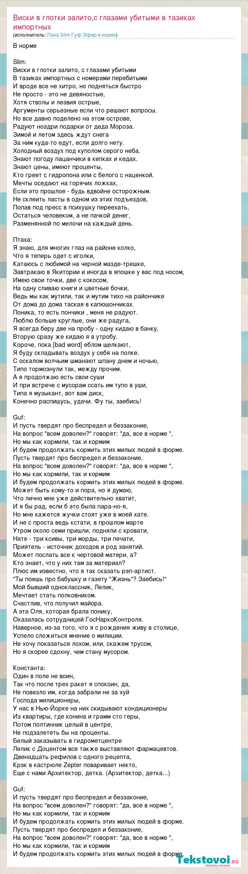 В норме Slim: Виски в глотки залито, с глазами убитыми В тазиках импортных с номерами перебитыми И вроде все не хитро, но подняться быстро Не просто - это не девяностые, Хотя стволы и лезвия острые, Аргументы серьезные если что решают вопросы. Но все давно поделено на этом острове, Радуют ноздри подарки от деда Мороза. Зимой и летом здесь ждут снега За ним куда-то едут, если долго нету. Холодный воздух под куполом серого неба. Знают погоду пацанчики в кепках и кедах. Знают цены, имеют проценты, Кто греет с гидропона или с белого с наценкой. Мечты оседают на горячих ложках, Если это прошлое - будь вдвойне осторожным. Не склеить ласты в одном из этих подъездов, Попав под пресс в психушку переехать, Остаться человеком, а не пачкой денег, Разменянной по мелочи на каждый день. Птаха: Я знаю, для многих глаз на районе колко, Что я теперь одет с иголки, Катаюсь с любимой на черной мазде-трешке, Завтракаю в Якитории и иногда в япошке у вас под носом, Имею свои точки, две с кокосом, На одну сливаю книги и цветные бочки, Ведь мы как мутили, так и мутим тихо на райончике От дома до дома таская в капюшончиках. Поника, то есть пончики , меня не радуют. Люблю больше круглые, они же радуга, Я всегда беру две на пробу - одну кидаю в банку, Вторую сразу же кидаю я в утробу. Короче, пока [bad word] еблом щелкают, Я буду складывать воздух у себя на полке. С оскалом волчьим шманают шпану днем и ночью, Типо тормознули так, между прочим. А я продолжаю есть свои суши И при встрече с мусорам ссать им тупо в уши, Типа я музыкант, вот вам диск, Конечно распишусь, удачи. Фу ты, заебись! Guf: И пусть твердят про беспредел и беззаконие, На вопрос "всем доволен?" говорят: "да, все в норме ", Но мы как кормили, так и кормим И будем продолжать кормить этих милых людей в форме. Пусть твердят про беспредел и беззаконие, На вопрос "всем доволен?" говорят: "да, все в норме ", Но мы как кормили, так и кормим И будем продолжать кормить этих милых людей в форме. Может быть кому-то и пора, но я думаю, Что лично мне уже действительно хватит, И я бы рад, если б это была пара-но-я, Но мне кажется жучки стоят уже в моей хате. И не с проста ведь кстати, в прошлом марте Утром около семи пришли, подняли с кровати, Нате - три ксивы, три морды, три печати, Приятель - источник доходов и род занятий. Может послать все к чертовой матери, а? Кто знает, что у них там за материал? Плюс им известно, что я так сказать рэп-артист. "Ты поешь про бабушку и газету "Жизнь"? Заебись!" Мой бывший одноклассник, Лелик, Мечтает стать полковником. Счастлив, что получил майора. А эта Оля, которая брала понику, Оказалась сотрудницей ГосНаркоКонтроля. Наверное, из-за того, что я с рождения живу в столице, Успело сложиться мнение о милиции. Не хочу показаться лохом, или, скажем трусом, Но я скорее сдохну, чем стану мусором. Константа: Один в поле не воин, Так что после трех ракет я спокоин, да, Не повезло им, когда забрали не за хуй Господа милиционеры, У нас в Нью-Йорке на них скидывают кондиционеры Из квартиры, где конина и грамм сто геры, Потом полтинник целый в центре, Не подзалететь бы на проценты. Белый заказывать в гидрометцентре Лелик с Доцентом все также выставляют фармацевтов. Двенадцать рефилов с одного рецепта, Крэк в кастрюле Zepter поваривает некто, Еще с нами Архитектор, детка. (Архитектор, детка...) Guf: И пусть твердят про беспредел и беззаконие, На вопрос "всем доволен?" г