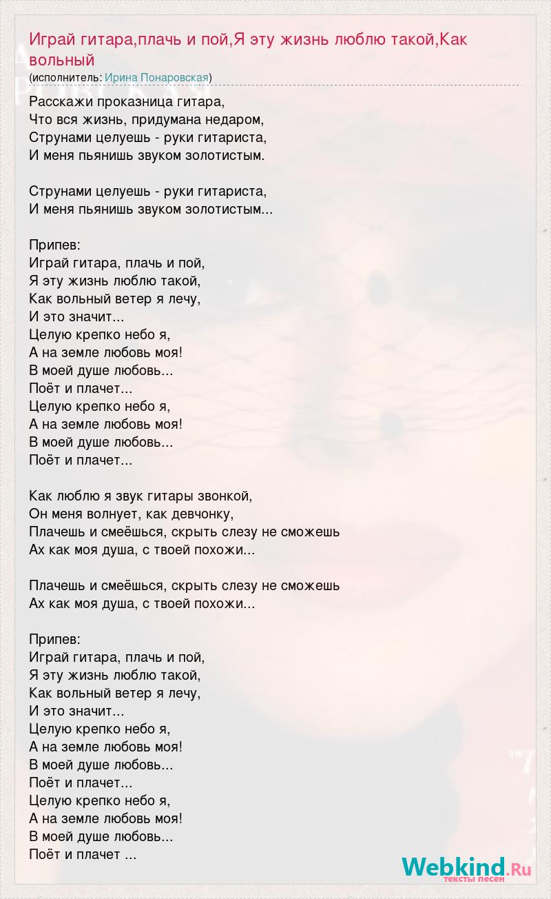 Расскажи проказница гитара, Что вся жизнь, придумана недаром, Струнами целуешь - руки гитариста, И меня пьянишь звуком золотистым. Струнами целуешь - руки гитариста, И меня пьянишь звуком золотистым... Припев: Играй гитара, плачь и пой, Я эту жизнь люблю такой, Как вольный ветер я лечу, И это значит... Целую крепко небо я, А на земле любовь моя! В моей душе любовь... Поёт и плачет... Целую крепко небо я, А на земле любовь моя! В моей душе любовь... Поёт и плачет... Как люблю я звук гитары звонкой, Он меня волнует, как девчонку, Плачешь и смеёшься, скрыть слезу не сможешь Ах как моя душа, с твоей похожи... Плачешь и смеёшься, скрыть слезу не сможешь Ах как моя душа, с твоей похожи... Припев: Играй гитара, плачь и пой, Я эту жизнь люблю такой, Как вольный ветер я лечу, И это значит... Целую крепко небо я, А на земле любовь моя! В моей душе любовь... Поёт и плачет... Целую крепко небо я, А на земле любовь моя! В моей душе любовь... Поёт и плачет ...