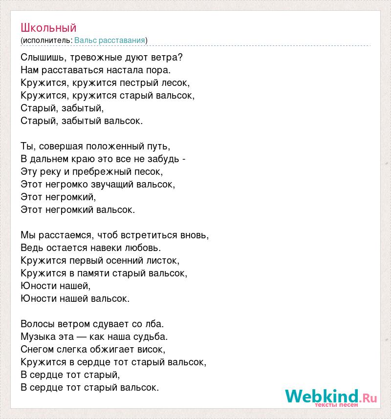 Слышишь, тревожные дуют ветра? Нам расставаться настала пора. Кружится, кружится пестрый лесок, Кружится, кружится старый вальсок, Старый, забытый, Старый, забытый вальсок. Ты, совершая положенный путь, В дальнем краю это все не забудь - Эту реку и пребрежный песок, Этот негромко звучащий вальсок, Этот негромкий, Этот негромкий вальсок. Мы расстаемся, чтоб встретиться вновь, Ведь остается навеки любовь. Кружится первый осенний листок, Кружится в памяти старый вальсок, Юности нашей, Юности нашей вальсок. Волосы ветром сдувает со лба. Музыка эта — как наша судьба. Снегом слегка обжигает висок, Кружится в сердце тот старый вальсок, В сердце тот старый, В сердце тот старый вальсок.
