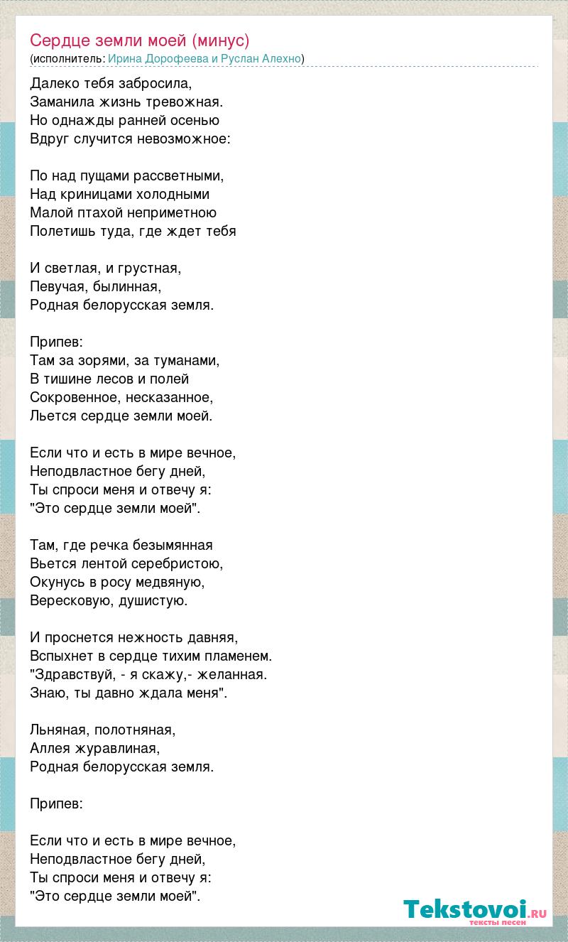 Далеко тебя забросила, Заманила жизнь тревожная. Но однажды ранней осенью Вдруг случится невозможное: По над пущами рассветными, Над криницами холодными Малой птахой неприметною Полетишь туда, где ждет тебя И светлая, и грустная, Певучая, былинная, Родная белорусская земля. Припев: Там за зорями, за туманами, В тишине лесов и полей Сокровенное, несказанное, Льется сердце земли моей. Если что и есть в мире вечное, Неподвластное бегу дней, Ты спроси меня и отвечу я: "Это сердце земли моей". Там, где речка безымянная Вьется лентой серебристою, Окунусь в росу медвяную, Вересковую, душистую. И проснется нежность давняя, Вспыхнет в сердце тихим пламенем. "Здравствуй, - я скажу,- желанная. Знаю, ты давно ждала меня". Льняная, полотняная, Аллея журавлиная, Родная белорусская земля. Припев: Если что и есть в мире вечное, Неподвластное бегу дней, Ты спроси меня и отвечу я: "Это сердце земли моей".