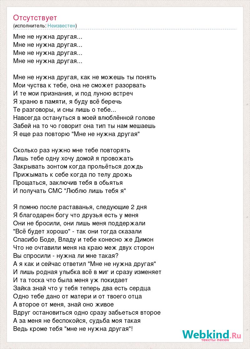 Мне не нужна другая... Мне не нужна другая... Мне не нужна другая... Мне не нужна другая... Мне не нужна другая, как не можешь ты понять Мои чуства к тебе, она не сможет разорвать И те мои признания, и под луною встреч Я храню в памяти, я буду всё беречь Те разговоры, и сны лишь о тебе... Навсегда остануться в моей влюблённой голове Забей на то чо говорит она тип ты нам мешаешь Я еще раз повторю "Мне не нужна другая" Сколько раз нужно мне тебе повторять Лишь тебе одну хочу домой я провожать Закрывать зонтом когда прольёться дождь Прижымать к себе когда по телу дрожь Прощаться, заключив тебя в обьятья И получать СМС "Люблю лишь тебя я" Я помню после раставанья, следующие 2 дня Я благодарен богу что друзья есть у меня Они не бросили, они лишь меня поддержали "Всё будет хорошо" - так они тогда сказали Спасибо Боде, Владу и тебе конесно же Димон Что не очтавили меня на краю меж двух сторон Вы спросили - нужна ли мне такая? А я как и сейчас ответил "Мне не нужна другая" И лишь родная улыбка всё в миг и сразу изменяет И та тоска что была меня уж покидает Зайка знай что у тебя теперь два есть сердца Одно тебе дано от матери и от твоего отца А второе от меня, знай оно живое Вдруг остановиться одно сразу забьеться второе А за меня не беспокойся, судьба моя такая Ведь кроме тебя "мне не нужна другая"!