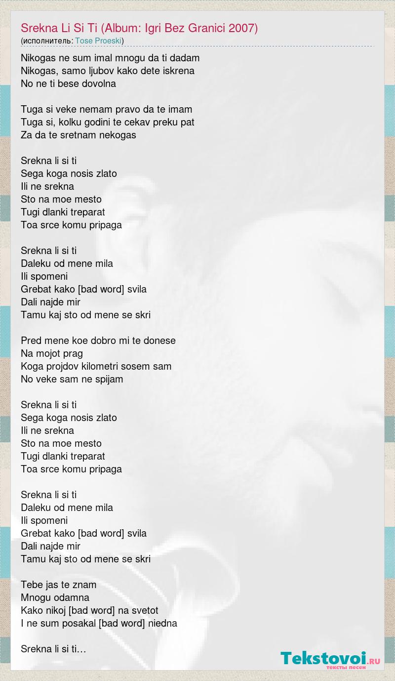 Nikogas ne sum imal mnogu da ti dadam Nikogas, samo ljubov kako dete iskrena No ne ti bese dovolna Tuga si veke nemam pravo da te imam Tuga si, kolku godini te cekav preku pat Za da te sretnam nekogas Srekna li si ti Sega koga nosis zlato Ili ne srekna Sto na moe mesto Tugi dlanki treparat Toa srce komu pripaga Srekna li si ti Daleku od mene mila Ili spomeni Grebat kako gruba svila Dali najde mir Tamu kaj sto od mene se skri Pred mene koe dobro mi te donese Na mojot prag Koga projdov kilometri sosem sam No veke sam ne spijam Srekna li si ti Sega koga nosis zlato Ili ne srekna Sto na moe mesto Tugi dlanki treparat Toa srce komu pripaga Srekna li si ti Daleku od mene mila Ili spomeni Grebat kako gruba svila Dali najde mir Tamu kaj sto od mene se skri Tebe jas te znam Mnogu odamna Kako nikoj drug na svetot I ne sum posakal druga niedna Srekna li si ti…
