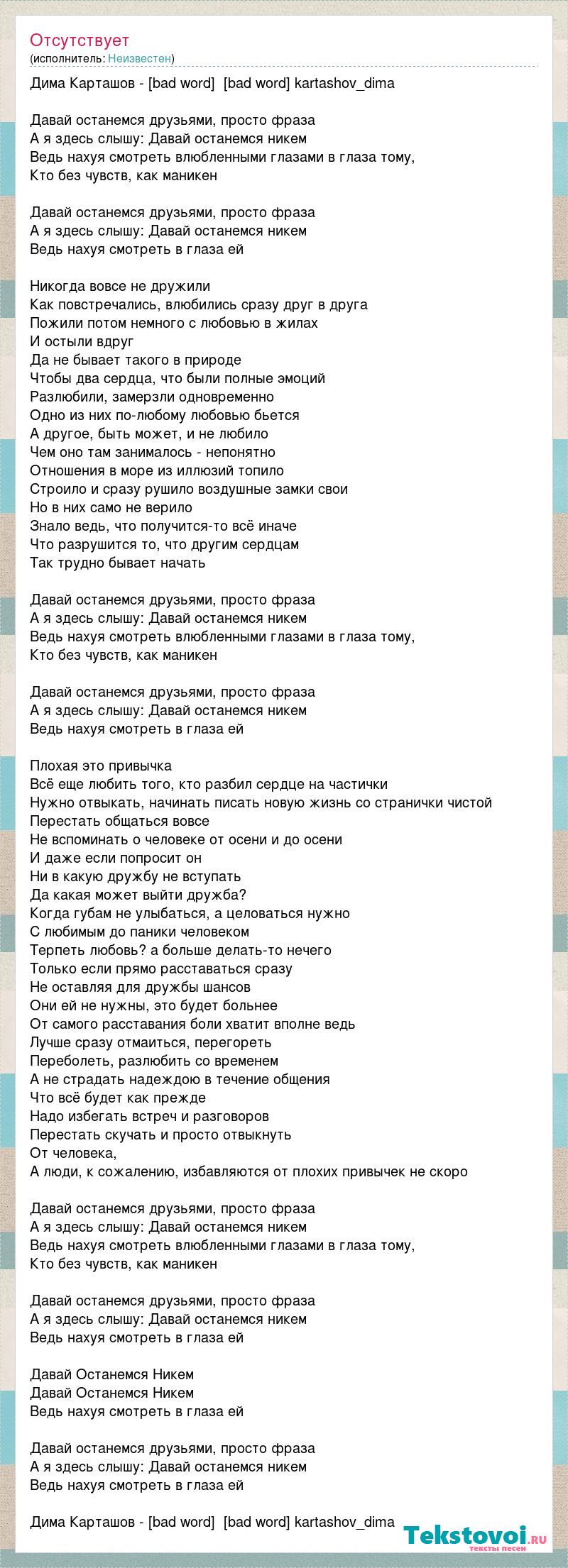 Дима Карташов - [bad word] [bad word] kartashov_dima Давай останемся друзьями, просто фраза А я здесь слышу: Давай останемся никем Ведь нахуя смотреть влюбленными глазами в глаза тому, Кто без чувств, как маникен Давай останемся друзьями, просто фраза А я здесь слышу: Давай останемся никем Ведь нахуя смотреть в глаза ей Никогда вовсе не дружили Как повстречались, влюбились сразу друг в друга Пожили потом немного с любовью в жилах И остыли вдруг Да не бывает такого в природе Чтобы два сердца, что были полные эмоций Разлюбили, замерзли одновременно Одно из них по-любому любовью бьется А другое, быть может, и не любило Чем оно там занималось - непонятно Отношения в море из иллюзий топило Строило и сразу рушило воздушные замки свои Но в них само не верило Знало ведь, что получится-то всё иначе Что разрушится то, что другим сердцам Так трудно бывает начать Давай останемся друзьями, просто фраза А я здесь слышу: Давай останемся никем Ведь нахуя смотреть влюбленными глазами в глаза тому, Кто без чувств, как маникен Давай останемся друзьями, просто фраза А я здесь слышу: Давай останемся никем Ведь нахуя смотреть в глаза ей Плохая это привычка Всё еще любить того, кто разбил сердце на частички Нужно отвыкать, начинать писать новую жизнь со странички чистой Перестать общаться вовсе Не вспоминать о человеке от осени и до осени И даже если попросит он Ни в какую дружбу не вступать Да какая может выйти дружба? Когда губам не улыбаться, а целоваться нужно С любимым до паники человеком Терпеть любовь? а больше делать-то нечего Только если прямо расставаться сразу Не оставляя для дружбы шансов Они ей не нужны, это будет больнее От самого расставания боли хватит вполне ведь Лучше сразу отмаиться, перегореть Переболеть, разлюбить со временем А не страдать надеждою в течение общения Что всё будет как прежде Надо избегать встреч и разговоров Перестать скучать и просто отвыкнуть От человека, А люди, к сожалению, избавляются от плохих привычек не скоро Давай останемся друзьями, просто фраза А я здесь слышу: Давай останемся никем Ведь нахуя смотреть влюбленными глазами в глаза тому, Кто без чувств, как маникен Давай останемся друзьями, просто фраза А я здесь слышу: Давай останемся никем Ведь нахуя смотреть в глаза ей Давай Останемся Никем Давай Останемся Никем Ведь нахуя смотреть в глаза ей Давай останемся друзьями, просто фраза А я здесь слышу: Давай останемся никем Ведь нахуя смотреть в глаза ей Дима Карташов - [bad word] [bad word] kartashov_dima