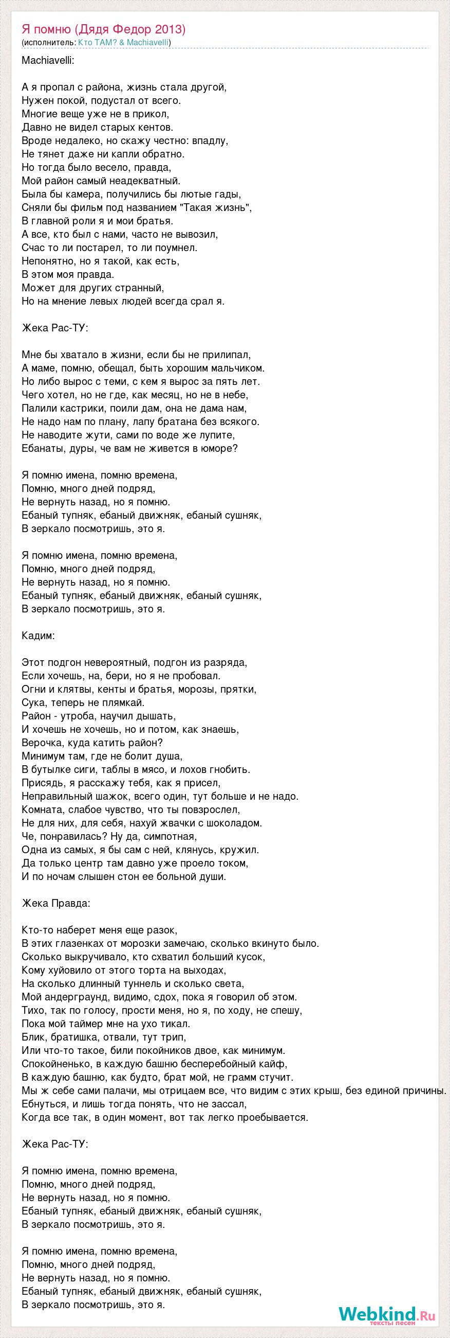 Machiavelli: А я пропал с района, жизнь стала другой, Нужен покой, подустал от всего. Многие веще уже не в прикол, Давно не видел старых кентов. Вроде недалеко, но скажу честно: впадлу, Не тянет даже ни капли обратно. Но тогда было весело, правда, Мой район самый неадекватный. Была бы камера, получились бы лютые гады, Сняли бы фильм под названием "Такая жизнь", В главной роли я и мои братья. А все, кто был с нами, часто не вывозил, Счас то ли постарел, то ли поумнел. Непонятно, но я такой, как есть, В этом моя правда. Может для других странный, Но на мнение левых людей всегда срал я. Жека Рас-ТУ: Мне бы хватало в жизни, если бы не прилипал, А маме, помню, обещал, быть хорошим мальчиком. Но либо вырос с теми, с кем я вырос за пять лет. Чего хотел, но не где, как месяц, но не в небе, Палили кастрики, поили дам, она не дама нам, Не надо нам по плану, лапу братана без всякого. Не наводите жути, сами по воде же лупите, Ебанаты, дуры, че вам не живется в юморе? Я помню имена, помню времена, Помню, много дней подряд, Не вернуть назад, но я помню. Ебаный тупняк, ебаный движняк, ебаный сушняк, В зеркало посмотришь, это я. Я помню имена, помню времена, Помню, много дней подряд, Не вернуть назад, но я помню. Ебаный тупняк, ебаный движняк, ебаный сушняк, В зеркало посмотришь, это я. Кадим: Этот подгон невероятный, подгон из разряда, Если хочешь, на, бери, но я не пробовал. Огни и клятвы, кенты и братья, морозы, прятки, Сука, теперь не плямкай. Район - утроба, научил дышать, И хочешь не хочешь, но и потом, как знаешь, Верочка, куда катить район? Минимум там, где не болит душа, В бутылке сиги, таблы в мясо, и лохов гнобить. Присядь, я расскажу тебя, как я присел, Неправильный шажок, всего один, тут больше и не надо. Комната, слабое чувство, что ты повзрослел, Не для них, для себя, нахуй жвачки с шоколадом. Че, понравилась? Ну да, симпотная, Одна из самых, я бы сам с ней, клянусь, кружил. Да только центр там давно уже проело током, И по ночам слышен стон ее больной души. Жека Правда: Кто-то наберет меня еще разок, В этих глазенках от морозки замечаю, сколько вкинуто было. Сколько выкручивало, кто схватил больший кусок, Кому хуйовило от этого торта на выходах, На сколько длинный туннель и сколько света, Мой андерграунд, видимо, сдох, пока я говорил об этом. Тихо, так по голосу, прости меня, но я, по ходу, не спешу, Пока мой таймер мне на ухо тикал. Блик, братишка, отвали, тут трип, Или что-то такое, били покойников двое, как минимум. Спокойненько, в каждую башню бесперебойный кайф, В каждую башню, как будто, брат мой, не грамм стучит. Мы ж себе сами палачи, мы отрицаем все, что видим с этих крыш, без единой причины. Ебнуться, и лишь тогда понять, что не зассал, Когда все так, в один момент, вот так легко проебывается. Жека Рас-ТУ: Я помню имена, помню времена, Помню, много дней подряд, Не вернуть назад, но я помню. Ебаный тупняк, ебаный движняк, ебаный сушняк, В зеркало посмотришь, это я. Я помню имена, помню времена, Помню, много дней подряд, Не вернуть назад, но я помню. Ебаный тупняк, ебаный движняк, ебаный сушняк, В зеркало посмотришь, это я.