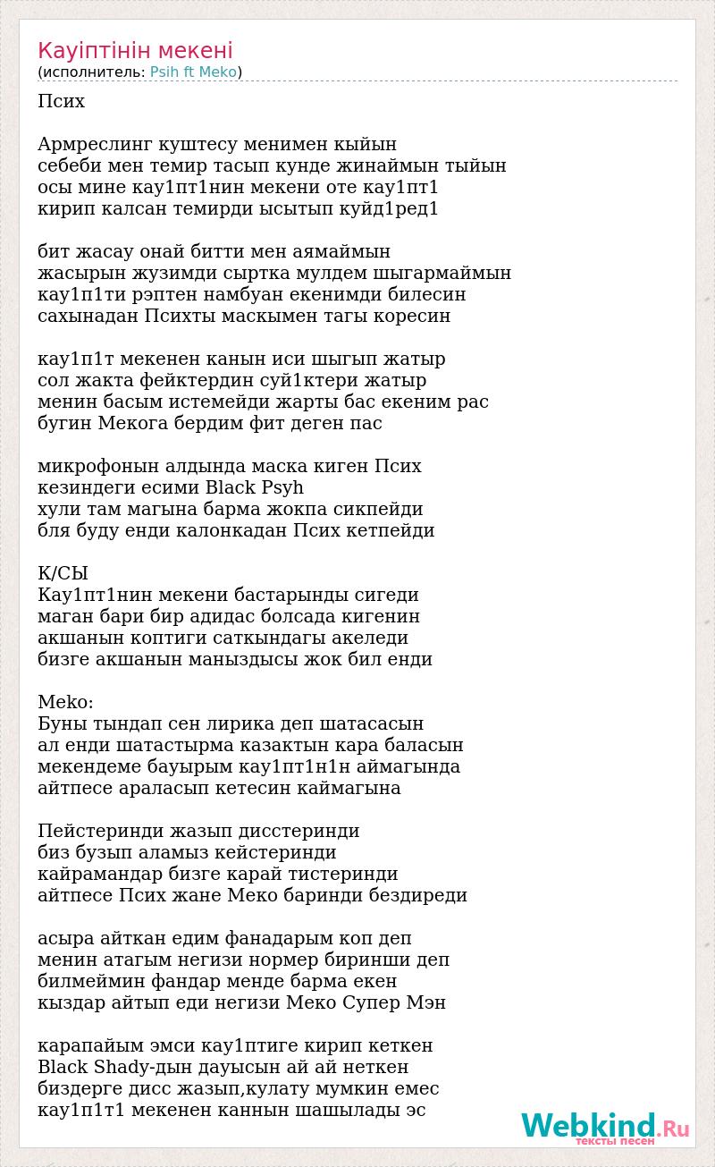 Псих Армреслинг куштесу менимен кыйын себеби мен темир тасып кунде жинаймын тыйын осы мине кау1пт1нин мекени оте кау1пт1 кирип калсан темирди ысытып куйд1ред1 бит жасау онай битти мен аямаймын жасырын жузимди сыртка мулдем шыгармаймын кау1п1ти рэптен намбуан екенимди билесин сахынадан Психты маскымен тагы коресин кау1п1т мекенен канын иси шыгып жатыр сол жакта фейктердин суй1ктери жатыр менин басым истемейди жарты бас екеним рас бугин Мекога бердим фит деген пас микрофонын алдында маска киген Псих кезиндеги есими Black Psyh хули там магына барма жокпа сикпейди бля буду енди калонкадан Псих кетпейди К/СЫ Кау1пт1нин мекени бастарынды сигеди маган бари бир адидас болсада кигенин акшанын коптиги саткындагы акеледи бизге акшанын маныздысы жок бил енди Meko: Буны тындап сен лирика деп шатасасын ал енди шатастырма казактын кара баласын мекендеме бауырым кау1пт1н1н аймагында айтпесе араласып кетесин каймагына Пейстеринди жазып дисстеринди биз бузып аламыз кейстеринди кайрамандар бизге карай тистеринди айтпесе Псих жане Меко баринди бездиреди асыра айткан едим фанадарым коп деп менин атагым негизи нормер биринши деп билмеймин фандар менде барма екен кыздар айтып еди негизи Меко Супер Мэн карапайым эмси кау1птиге кирип кеткен Black Shady-дын дауысын ай ай неткен биздерге дисс жазып,кулату мумкин емес кау1п1т1 мекенен каннын шашылады эс