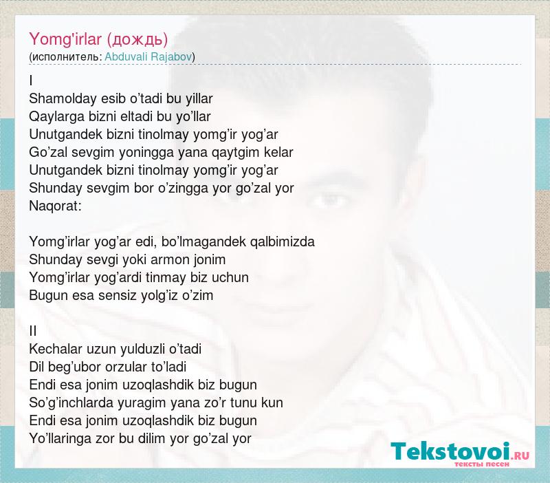 I Shamolday esib o’tadi bu yillar Qaylarga bizni eltadi bu yo’llar Unutgandek bizni tinolmay yomg’ir yog’ar Go’zal sevgim yoningga yana qaytgim kelar Unutgandek bizni tinolmay yomg’ir yog’ar Shunday sevgim bor o’zingga yor go’zal yor Naqorat: Yomg’irlar yog’ar edi, bo’lmagandek qalbimizda Shunday sevgi yoki armon jonim Yomg’irlar yog’ardi tinmay biz uchun Bugun esa sensiz yolg’iz o’zim II Kechalar uzun yulduzli o’tadi Dil beg’ubor orzular to’ladi Endi esa jonim uzoqlashdik biz bugun So’g’inchlarda yuragim yana zo’r tunu kun Endi esa jonim uzoqlashdik biz bugun Yo’llaringa zor bu dilim yor go’zal yor