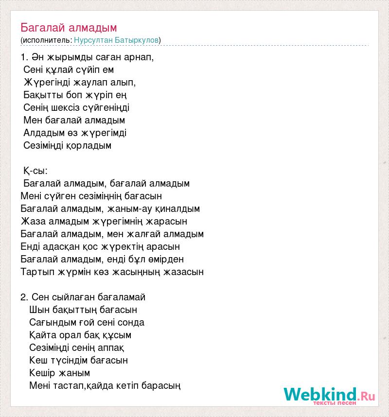 1. Ән жырымды саған арнап, Сені құлай сүйіп ем Жүрегінді жаулап алып, Бақытты боп жүріп ең Сенің шексіз сүйгеніңді Мен бағалай алмадым Алдадым өз жүрегімді Сезіміңді қорладым Қ-сы: Бағалай алмадым, бағалай алмадым Мені сүйген сезіміңнің бағасын Бағалай алмадым, жаным-ау қиналдым Жаза алмадым жүрегімнің жарасын Бағалай алмадым, мен жалғай алмадым Енді адасқан қос жүректің арасын Бағалай алмадым, енді бұл өмірден Тартып жүрмін көз жасыңның жазасын 2. Сен сыйлаған бағаламай Шын бақыттың бағасын Сағындым ғой сені сонда Қайта орал бақ құсым Сезіміңді сенің аппақ Кеш түсіндім бағасын Кешір жаным Мені тастап,қайда кетіп барасың