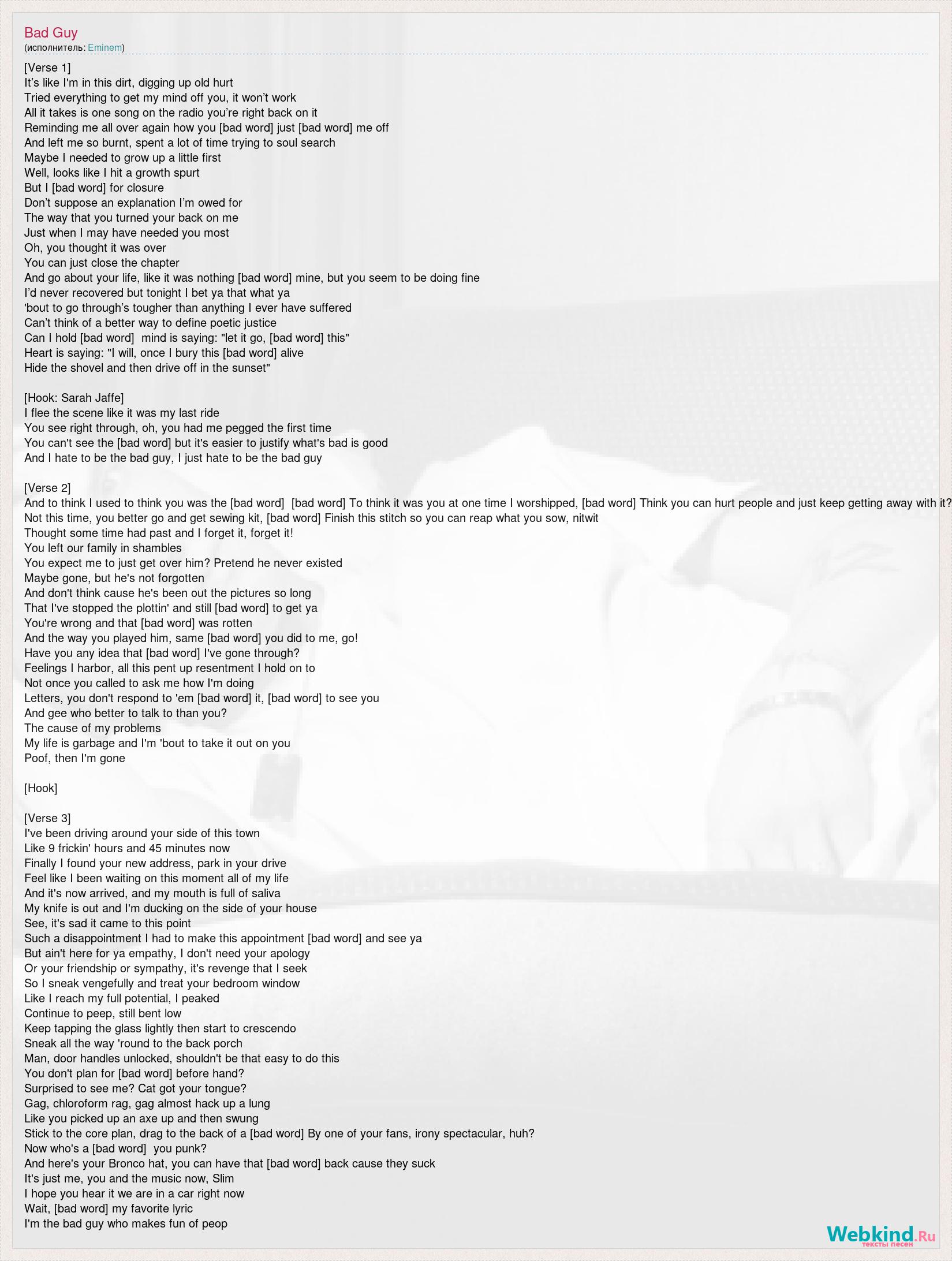 [Verse 1] It’s like I'm in this dirt, digging up old hurt Tried everything to get my mind off you, it won’t work All it takes is one song on the radio you’re right back on it Reminding me all over again how you [bad word] just [bad word] me off And left me so burnt, spent a lot of time trying to soul search Maybe I needed to grow up a little first Well, looks like I hit a growth spurt But I [bad word] for closure Don’t suppose an explanation I’m owed for The way that you turned your back on me Just when I may have needed you most Oh, you thought it was over You can just close the chapter And go about your life, like it was nothing [bad word] mine, but you seem to be doing fine I’d never recovered but tonight I bet ya that what ya 'bout to go through’s tougher than anything I ever have suffered Can’t think of a better way to define poetic justice Can I hold [bad word] mind is saying: "let it go, [bad word] this" Heart is saying: "I will, once I bury this [bad word] alive Hide the shovel and then drive off in the sunset" [Hook: Sarah Jaffe] I flee the scene like it was my last ride You see right through, oh, you had me pegged the first time You can't see the [bad word] but it's easier to justify what's bad is good And I hate to be the bad guy, I just hate to be the bad guy [Verse 2] And to think I used to think you was the [bad word] [bad word] To think it was you at one time I worshipped, [bad word] Think you can hurt people and just keep getting away with it? Not this time, you better go and get sewing kit, [bad word] Finish this stitch so you can reap what you sow, nitwit Thought some time had past and I forget it, forget it! You left our family in shambles You expect me to just get over him? Pretend he never existed Maybe gone, but he's not forgotten And don't think cause he's been out the pictures so long That I've stopped the plottin' and still [bad word] to get ya You're wrong and that [bad word] was rotten And the way you played him, same [bad word] you did to me, go! Have you any idea that [bad word] I've gone through? Feelings I harbor, all this pent up resentment I hold on to Not once you called to ask me how I'm doing Letters, you don't respond to 'em [bad word] it, [bad word] to see you And gee who better to talk to than you? The cause of my problems My life is garbage and I'm 'bout to take it out on you Poof, then I'm gone [Hook] [Verse 3] I've been driving around your side of this town Like 9 frickin' hours and 45 minutes now Finally I found your new address, park in your drive Feel like I been waiting on this moment all of my life And it's now arrived, and my mouth is full of saliva My knife is out and I'm ducking on the side of your house See, it's sad it came to this point Such a disappointment I had to make this appointment [bad word] and see ya But ain't here for ya empathy, I don't need your apology Or your friendship or sympathy, it's revenge that I seek So I sneak vengefully and treat your bedroom window Like I reach my full potential, I peaked Continue to peep, still bent low Keep tapping the glass lightly then start to crescendo Sneak all the way 'round to the back porch Man, door handles unlocked, shouldn't be that easy to do this You don't plan for [bad word] before hand? Surprised to see me? Cat got your tongue? Gag, chloroform rag, gag almost hack up a lung Like you picked up an axe up and then swung Stick to the core plan, drag to the back of a [bad word] By one of your fans, irony spectacular, huh? Now who's a [bad word] you punk? And here's your Bronco hat, you can have that [bad word] back cause they suck It's just me, you and the music now, Slim I hope you hear it we are in a car right now Wait, [bad word] my favorite lyric I'm the bad guy who makes fun of peop