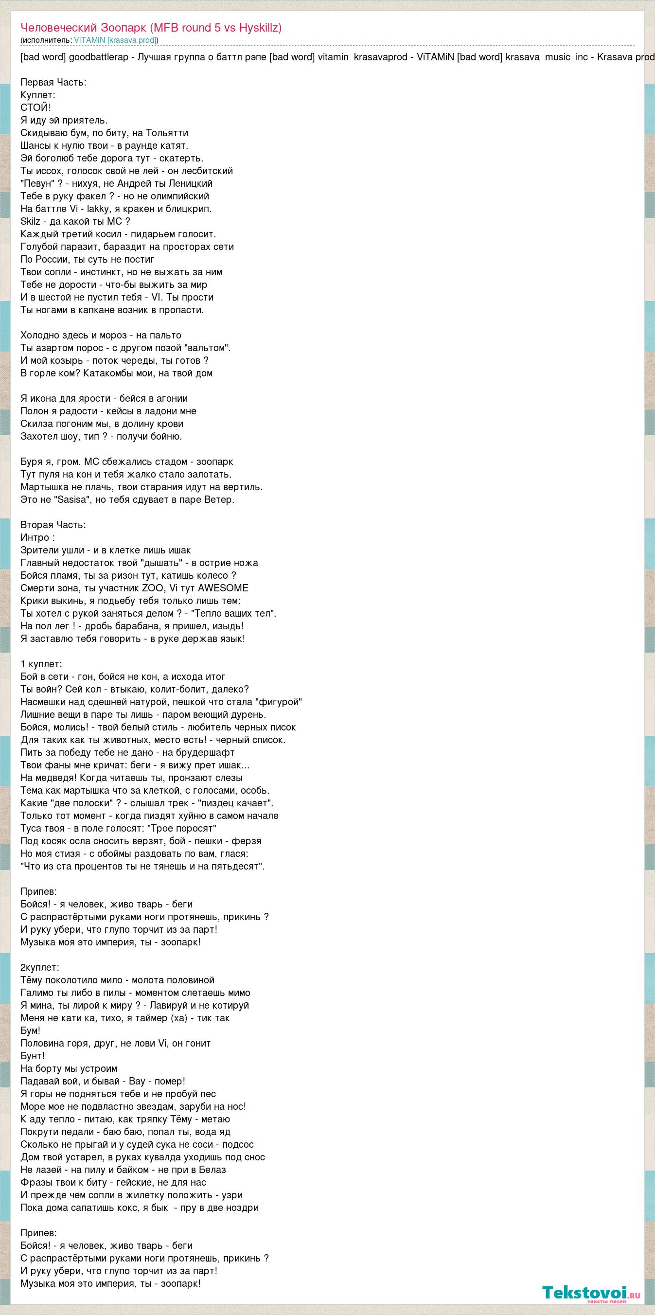 [bad word] goodbattlerap - Лучшая группа о баттл рэпе [bad word] vitamin_krasavaprod - ViTAMiN [bad word] krasava_music_inc - Krasava prod Первая Часть: Куплет: СТОЙ! Я иду эй приятель. Скидываю бум, по биту, на Тольятти Шансы к нулю твои - в раунде катят. Эй боголюб тебе дорога тут - скатерть. Ты иссох, голосок свой не лей - он лесбитский "Певун" ? - нихуя, не Андрей ты Леницкий Тебе в руку факел ? - но не олимпийский На баттле Vi - lakky, я кракен и блицкрип. Skilz - да какой ты МС ? Каждый третий косил - пидарьем голосит. Голубой паразит, бараздит на просторах сети По России, ты суть не постиг Твои сопли - инстинкт, но не выжать за ним Тебе не дорости - что-бы выжить за мир И в шестой не пустил тебя - VI. Ты прости Ты ногами в капкане возник в пропасти. Холодно здесь и мороз - на пальто Ты азартом порос - с другом позой "вальтом". И мой козырь - поток череды, ты готов ? В горле ком? Катакомбы мои, на твой дом Я икона для ярости - бейся в агонии Полон я радости - кейсы в ладони мне Скилза погоним мы, в долину крови Захотел шоу, тип ? - получи бойню. Буря я, гром. МС сбежались стадом - зоопарк Тут пуля на кон и тебя жалко стало залотать. Мартышка не плачь, твои старания идут на вертиль. Это не "Sasisa", но тебя сдувает в паре Ветер. Вторая Часть: Интро : Зрители ушли - и в клетке лишь ишак Главный недостаток твой "дышать" - в острие ножа Бойся пламя, ты за ризон тут, катишь колесо ? Смерти зона, ты участник ZOO, Vi тут AWESOME Крики выкинь, я подьебу тебя только лишь тем: Ты хотел с рукой заняться делом ? - "Тепло ваших тел". На пол лег ! - дробь барабана, я пришел, изыдь! Я заставлю тебя говорить - в руке держав язык! 1 куплет: Бой в сети - гон, бойся не кон, а исхода итог Ты войн? Сей кол - втыкаю, колит-болит, далеко? Насмешки над сдешней натурой, пешкой что стала "фигурой" Лишние вещи в паре ты лишь - паром веющий дурень. Бойся, молись! - твой белый стиль - любитель черных писок Для таких как ты животных, место есть! - черный список. Пить за победу тебе не дано - на брудершафт Твои фаны мне кричат: беги - я вижу прет ишак... На медведя! Когда читаешь ты, пронзают слезы Тема как мартышка что за клеткой, с голосами, особь. Какие "две полоски" ? - слышал трек - "пиздец качает". Только тот момент - когда пиздят хуйню в самом начале Туса твоя - в поле голосят: "Трое поросят" Под косяк осла сносить верзят, бой - пешки - ферзя Но моя стизя - с обоймы раздовать по вам, глася: "Что из ста процентов ты не тянешь и на пятьдесят". Припев: Бойся! - я человек, живо тварь - беги С распрастёртыми руками ноги протянешь, прикинь ? И руку убери, что глупо торчит из за парт! Музыка моя это империя, ты - зоопарк! 2куплет: Тёму поколотило мило - молота половиной Галимо ты либо в пилы - моментом слетаешь мимо Я мина, ты лирой к миру ? - Лавируй и не котируй Меня не кати ка, тихо, я таймер (ха) - тик так Бум! Половина горя, друг, не лови Vi, он гонит Бунт! На борту мы устроим Падавай вой, и бывай - Bay - помер! Я горы не подняться тебе и не пробуй пес Море мое не подвластно звездам, заруби на нос! К аду тепло - питаю, как тряпку Тёму - метаю Покрути педали - баю баю, попал ты, вода яд Сколько не прыгай и у судей сука не соси - подсос Дом твой устарел, в руках кувалда уходишь под снос Не лазей - на пилу и байком - не при в Белаз Фразы твои к биту - гейские, не для нас И прежде чем сопли в жилетку положить - узри Пока дома сапатишь кокс, я бык - пру в две ноздри Припев: Бойся! - я человек, живо тварь - беги С распрастёртыми руками ноги протянешь, прикинь ? И р