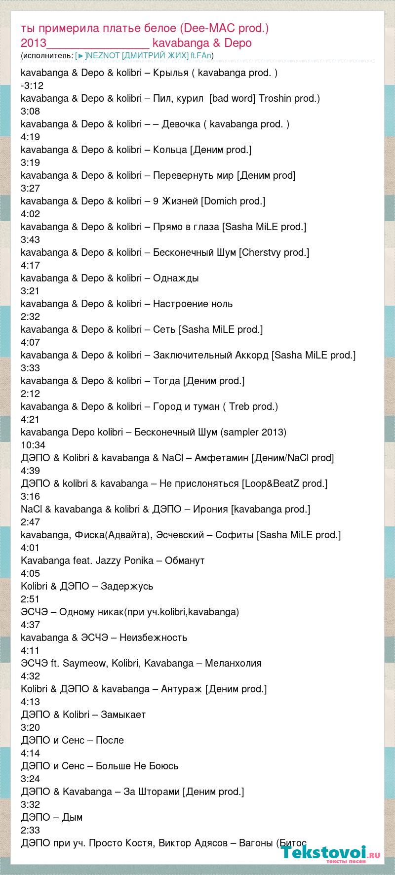 Главная→Исполнители→[►]NEZNOT [ДМИТРИЙ ЖИХ] ft.FAn→Ты примерила платье белое (Dee-MAC prod.) 2013________________ kavabanga & Depo