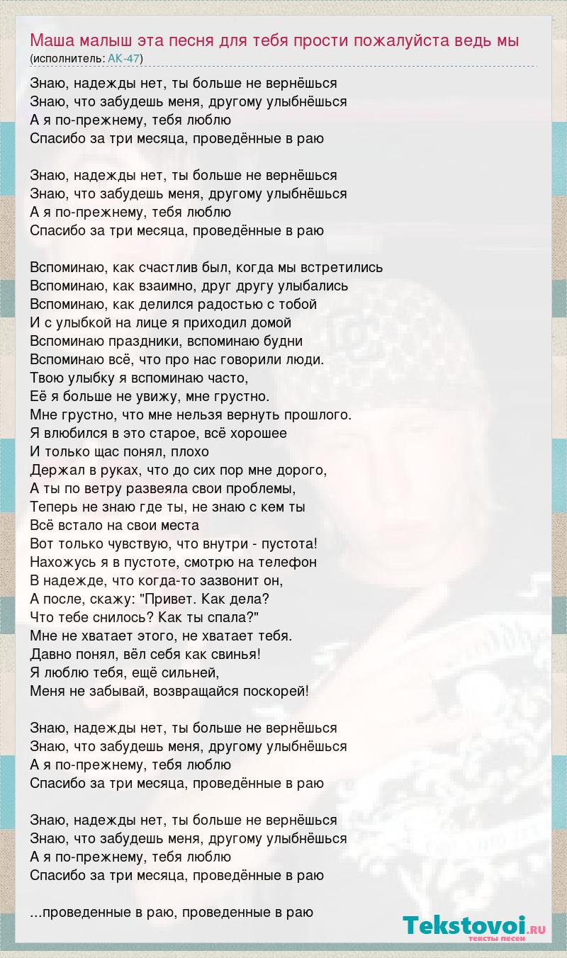 Главная→Исполнители→Ак-47→Маша малыш эта песня для тебя прости пожалуйста ведь мы не чужие с тобой люди