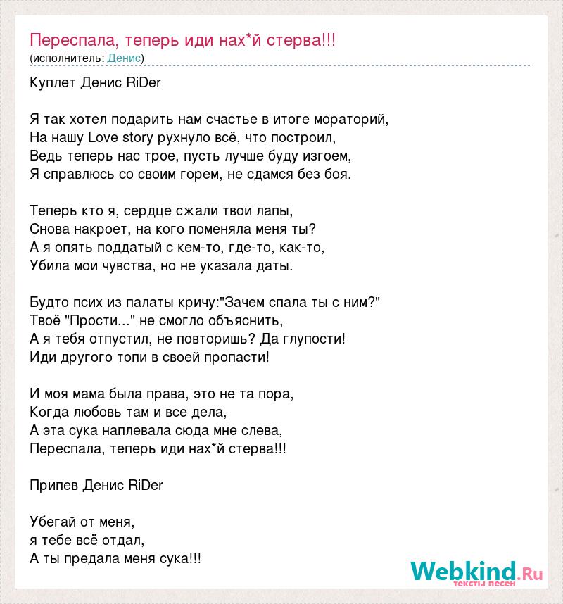 Куплет Денис RiDer Я так хотел подарить нам счастье в итоге мораторий, На нашу Love story рухнуло всё, что построил, Ведь теперь нас трое, пусть лучше буду изгоем, Я справлюсь со своим горем, не сдамся без боя. Теперь кто я, сердце сжали твои лапы, Снова накроет, на кого поменяла меня ты? А я опять поддатый с кем-то, где-то, как-то, Убила мои чувства, но не указала даты. Будто псих из палаты кричу:"Зачем спала ты с ним?" Твоё "Прости..." не смогло объяснить, А я тебя отпустил, не повторишь? Да глупости! Иди другого топи в своей пропасти! И моя мама была права, это не та пора, Когда любовь там и все дела, А эта сука наплевала сюда мне слева, Переспала, теперь иди нах*й стерва!!! Припев Денис RiDer Убегай от меня, я тебе всё отдал, А ты предала меня сука!!!