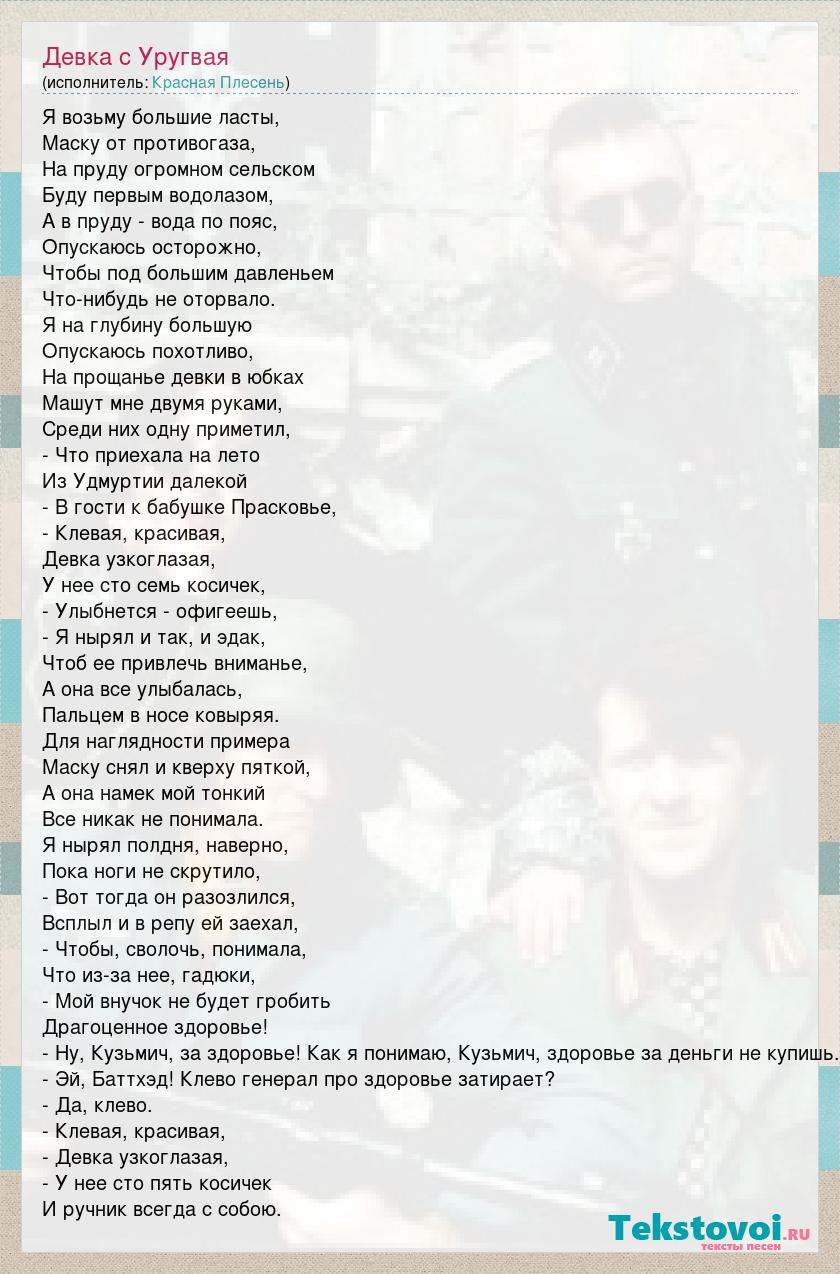 Я возьму большие ласты, Маску от противогаза, На пруду огромном сельском Буду первым водолазом, А в пруду - вода по пояс, Опускаюсь осторожно, Чтобы под большим давленьем Что-нибудь не оторвало. Я на глубину большую Опускаюсь похотливо, На прощанье девки в юбках Машут мне двумя руками, Среди них одну приметил, - Что приехала на лето Из Удмуртии далекой - В гости к бабушке Прасковье, - Клевая, красивая, Девка узкоглазая, У нее сто семь косичек, - Улыбнется - офигеешь, - Я нырял и так, и эдак, Чтоб ее привлечь вниманье, А она все улыбалась, Пальцем в носе ковыряя. Для наглядности примера Маску снял и кверху пяткой, А она намек мой тонкий Все никак не понимала. Я нырял полдня, наверно, Пока ноги не скрутило, - Вот тогда он разозлился, Всплыл и в репу ей заехал, - Чтобы, сволочь, понимала, Что из-за нее, гадюки, - Мой внучок не будет гробить Драгоценное здоровье! - Ну, Кузьмич, за здоровье! Как я понимаю, Кузьмич, здоровье за деньги не купишь. - Эй, Баттхэд! Клево генерал про здоровье затирает? - Да, клево. - Клевая, красивая, - Девка узкоглазая, - У нее сто пять косичек И ручник всегда с собою.