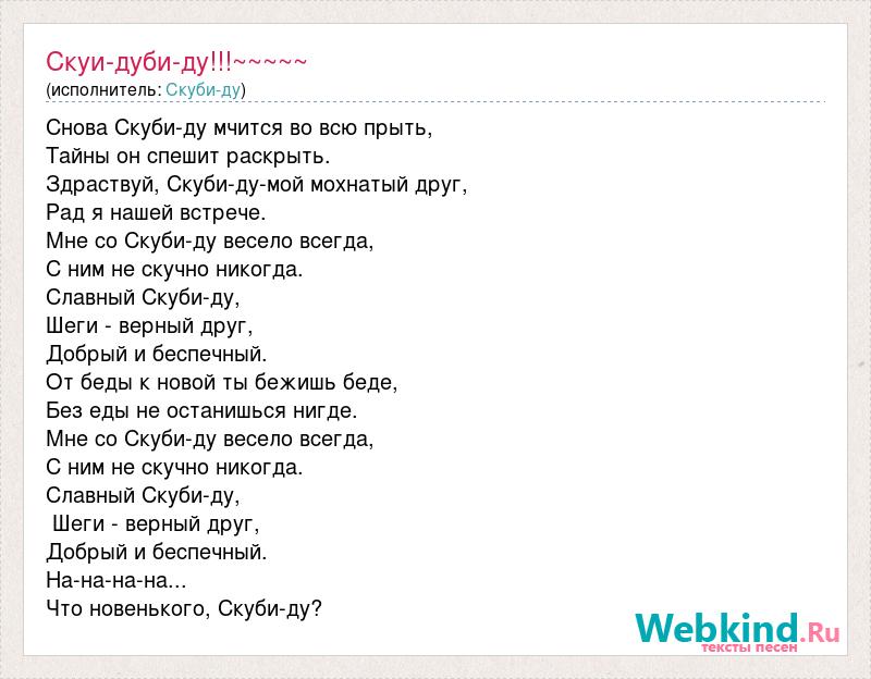 Снова Скуби-ду мчится во всю прыть, Тайны он спешит раскрыть. Здраствуй, Скуби-ду-мой мохнатый друг, Рад я нашей встрече. Мне со Скуби-ду весело всегда, С ним не скучно никогда. Славный Скуби-ду, Шеги - верный друг, Добрый и беспечный. От беды к новой ты бежишь беде, Без еды не останишься нигде. Мне со Скуби-ду весело всегда, С ним не скучно никогда. Славный Скуби-ду, Шеги - верный друг, Добрый и беспечный. На-на-на-на... Что новенького, Скуби-ду?