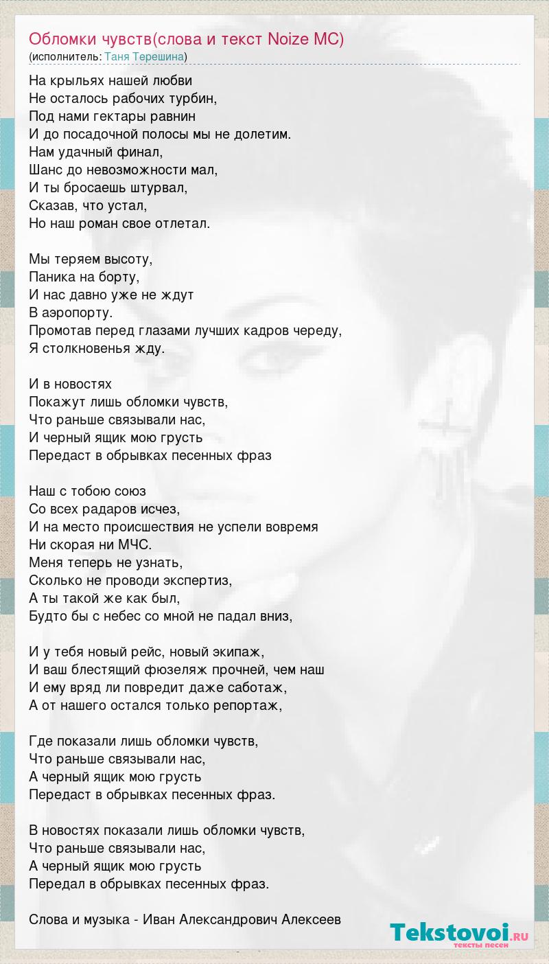 На крыльях нашей любви Не осталось рабочих турбин, Под нами гектары равнин И до посадочной полосы мы не долетим. Нам удачный финал, Шанс до невозможности мал, И ты бросаешь штурвал, Сказав, что устал, Но наш роман свое отлетал. Мы теряем высоту, Паника на борту, И нас давно уже не ждут В аэропорту. Промотав перед глазами лучших кадров череду, Я столкновенья жду. И в новостях Покажут лишь обломки чувств, Что раньше связывали нас, И черный ящик мою грусть Передаст в обрывках песенных фраз Наш с тобою союз Со всех радаров исчез, И на место происшествия не успели вовремя Ни скорая ни МЧС. Меня теперь не узнать, Сколько не проводи экспертиз, А ты такой же как был, Будто бы с небес со мной не падал вниз, И у тебя новый рейс, новый экипаж, И ваш блестящий фюзеляж прочней, чем наш И ему вряд ли повредит даже саботаж, А от нашего остался только репортаж, Где показали лишь обломки чувств, Что раньше связывали нас, А черный ящик мою грусть Передаст в обрывках песенных фраз. В новостях показали лишь обломки чувств, Что раньше связывали нас, А черный ящик мою грусть Передал в обрывках песенных фраз. Слова и музыка - Иван Александрович Алексеев