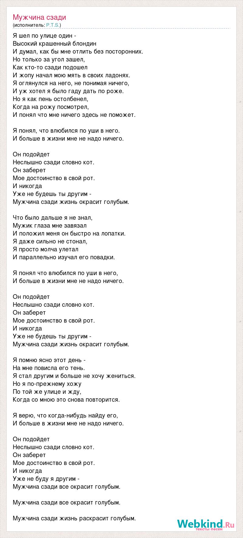 Я шел по улице один - Высокий крашенный блондин И думал, как бы мне отлить без посторонних. Но только за угол зашел, Как кто-то сзади подошел И жопу начал мою мять в своих ладонях. Я оглянулся на него, не понимая ничего, И уж хотел я было гаду дать по роже. Но я как пень остолбенел, Когда на рожу посмотрел, И понял что мне ничего здесь не поможет. Я понял, что влюбился по уши в него. И больше в жизни мне не надо ничего. Он подойдет Неслышно сзади словно кот. Он заберет Мое достоинство в свой рот. И никогда Уже не будешь ты другим - Мужчина сзади жизнь окрасит голубым. Что было дальше я не знал, Мужик глаза мне завязал И положил меня он быстро на лопатки. Я даже сильно не стонал, Я просто молча улетал И параллельно изучал его повадки. Я понял что влюбился по уши в него, И больше в жизни мне не надо ничего. Он подойдет Неслышно сзади словно кот. Он заберет Мое достоинство в свой рот. И никогда Уже не будешь ты другим - Мужчина сзади жизнь окрасит голубым. Я помню ясно этот день - На мне повисла его тень. Я стал другим и больше не хочу жениться. Но я по-прежнему хожу По той же улице и жду, Когда со мною это снова повторится. Я верю, что когда-нибудь найду его, И больше в жизни мне не надо ничего. Он подойдет Неслышно сзади словно кот. Он заберет Мое достоинство в свой рот. И никогда Уже не буду я другим - Мужчина сзади все окрасит голубым. Мужчина сзади все окрасит голубым. Мужчина сзади жизнь раскрасит голубым.