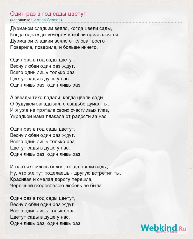 Дурманом сладким веяло, когда цвели сады, Когда однажды вечером в любви признался ты. Дурманом сладким веяло от слова твоего - Поверила, поверила, и больше ничего. Один раз в год сады цветут, Весну любви один раз ждут. Всего один лишь только раз Цветут сады в душе у нас. Один лишь раз, один лишь раз. А звезды тихо падали, когда цвели сады, О будущем загадывал, о свадьбе думал ты. И я уже не прятала своих счастливых глаз, Украдкой мама плакала от радости за нас. Один раз в год сады цветут, Весну любви один раз ждут. Всего один лишь только раз Цветут сады в душе у нас. Один лишь раз, один лишь раз. И платье шилось белое, когда цвели сады, Ну, что же тут поделаешь - другую встретил ты, Красивая и смелая дорогу перешла, Черешней скороспелою любовь её была. Один раз в год сады цветут, Весну любви один раз ждут. Всего один лишь только раз Цветут сады в душе у нас. Один лишь раз, один лишь раз.