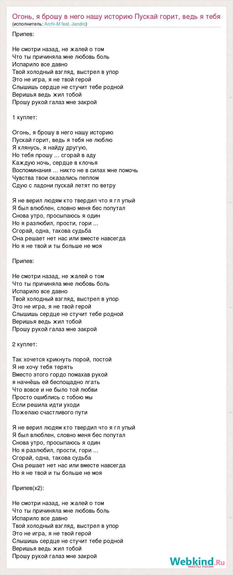 Припев: Не смотри назад, не жалей о том Что ты причиняла мне любовь боль Испарило все давно Твой холодный взгляд, выстрел в упор Это не игра, я не твой герой Слышишь сердце не стучит тебе родной Веришья ведь жил тобой Прошу рукой галаз мне закрой 1 куплет: Огонь, я брошу в него нашу историю Пускай горит, ведь я тебя не люблю Я клянусь, я найду другую, Но тебя прошу ... сгорай в аду Каждую ночь, сердце в клочья Воспоминания ... никто не в силах мне помочь Чувства твои оказались пеплом Сдую с ладони пускай летят по ветру Я не верил людям кто твердил что я гл упый Я был влюблен, словно меня бес попутал Снова утро, просыпаюсь я один Но я разлюбил, прости, гори ... Сгорай, одна, такова судьба Она решает нет нас или вместе навсегда Но я не твой и ты больше не моя Припев: Не смотри назад, не жалей о том Что ты причиняла мне любовь боль Испарило все давно Твой холодный взгляд, выстрел в упор Это не игра, я не твой герой Слышишь сердце не стучит тебе родной Веришья ведь жил тобой Прошу рукой галаз мне закрой 2 куплет: Так хочется крикнуть порой, постой Я не хочу тебя терять Вместо этого гордо помахав рукой я начнёшь ей беспощадно лгать Что вовсе и не было той любви Просто ошиблись с тобою мы Если решила идти уходи Пожелаю счастливого пути Я не верил людям кто твердил что я гл упый Я был влюблен, словно меня бес попутал Снова утро, просыпаюсь я один Но я разлюбил, прости, гори ... Сгорай, одна, такова судьба Она решает нет нас или вместе навсегда Но я не твой и ты больше не моя Припев(x2): Не смотри назад, не жалей о том Что ты причиняла мне любовь боль Испарило все давно Твой холодный взгляд, выстрел в упор Это не игра, я не твой герой Слышишь сердце не стучит тебе родной Веришья ведь жил тобой Прошу рукой галаз мне закрой