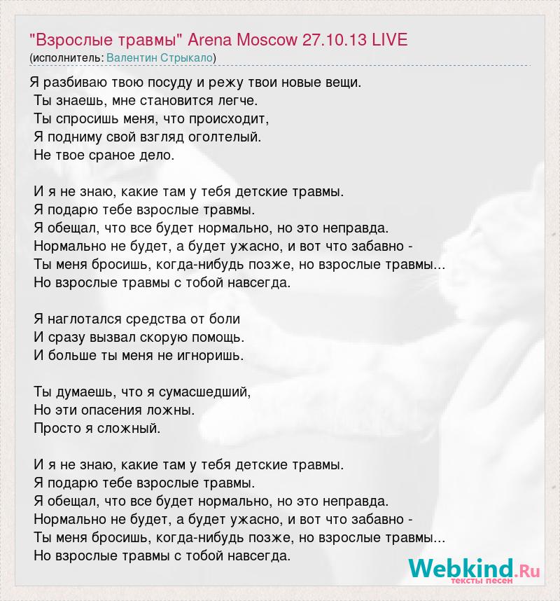 Я разбиваю твою посуду и режу твои новые вещи. Ты знаешь, мне становится легче. Ты спросишь меня, что происходит, Я подниму свой взгляд оголтелый. Не твое сраное дело. И я не знаю, какие там у тебя детские травмы. Я подарю тебе взрослые травмы. Я обещал, что все будет нормально, но это неправда. Нормально не будет, а будет ужасно, и вот что забавно - Ты меня бросишь, когда-нибудь позже, но взрослые травмы... Но взрослые травмы с тобой навсегда. Я наглотался средства от боли И сразу вызвал скорую помощь. И больше ты меня не игноришь. Ты думаешь, что я сумасшедший, Но эти опасения ложны. Просто я сложный. И я не знаю, какие там у тебя детские травмы. Я подарю тебе взрослые травмы. Я обещал, что все будет нормально, но это неправда. Нормально не будет, а будет ужасно, и вот что забавно - Ты меня бросишь, когда-нибудь позже, но взрослые травмы... Но взрослые травмы с тобой навсегда.