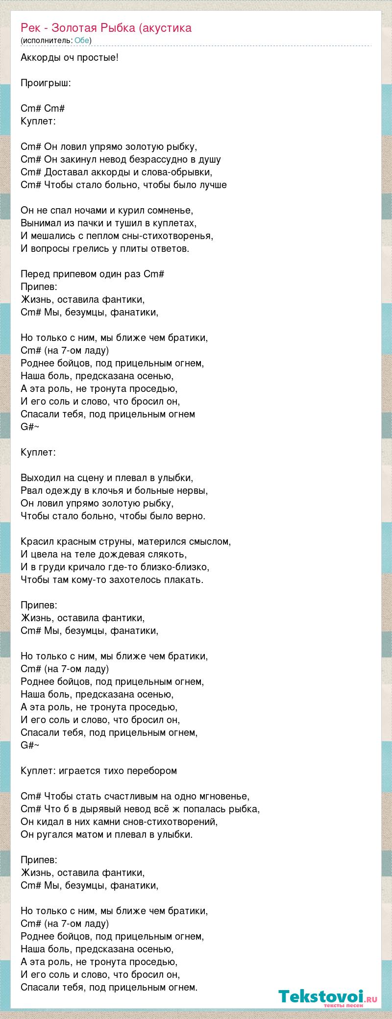 Аккорды оч простые! Проигрыш: Cm# Cm# Куплет: Cm# Он ловил упрямо золотую рыбку, Cm# Он закинул невод безрассудно в душу Cm# Доставал аккорды и слова-обрывки, Cm# Чтобы стало больно, чтобы было лучше Он не спал ночами и курил сомненье, Вынимал из пачки и тушил в куплетах, И мешались с пеплом сны-стихотворенья, И вопросы грелись у плиты ответов. Перед припевом один раз Cm# Припев: Жизнь, оставила фантики, Cm# Мы, безумцы, фанатики, Но только с ним, мы ближе чем братики, Cm# (на 7-ом ладу) Роднее бойцов, под прицельным огнем, Наша боль, предсказана осенью, А эта роль, не тронута проседью, И его соль и слово, что бросил он, Спасали тебя, под прицельным огнем G#~ Куплет: Выходил на сцену и плевал в улыбки, Рвал одежду в клочья и больные нервы, Он ловил упрямо золотую рыбку, Чтобы стало больно, чтобы было верно. Красил красным струны, матерился смыслом, И цвела на теле дождевая слякоть, И в груди кричало где-то близко-близко, Чтобы там кому-то захотелось плакать. Припев: Жизнь, оставила фантики, Cm# Мы, безумцы, фанатики, Но только с ним, мы ближе чем братики, Cm# (на 7-ом ладу) Роднее бойцов, под прицельным огнем, Наша боль, предсказана осенью, А эта роль, не тронута проседью, И его соль и слово, что бросил он, Спасали тебя, под прицельным огнем, G#~ Куплет: играется тихо перебором Cm# Чтобы стать счастливым на одно мгновенье, Cm# Что б в дырявый невод всё ж попалась рыбка, Он кидал в них камни снов-стихотворений, Он ругался матом и плевал в улыбки. Припев: Жизнь, оставила фантики, Cm# Мы, безумцы, фанатики, Но только с ним, мы ближе чем братики, Cm# (на 7-ом ладу) Роднее бойцов, под прицельным огнем, Наша боль, предсказана осенью, А эта роль, не тронута проседью, И его соль и слово, что бросил он, Спасали тебя, под прицельным огнем.