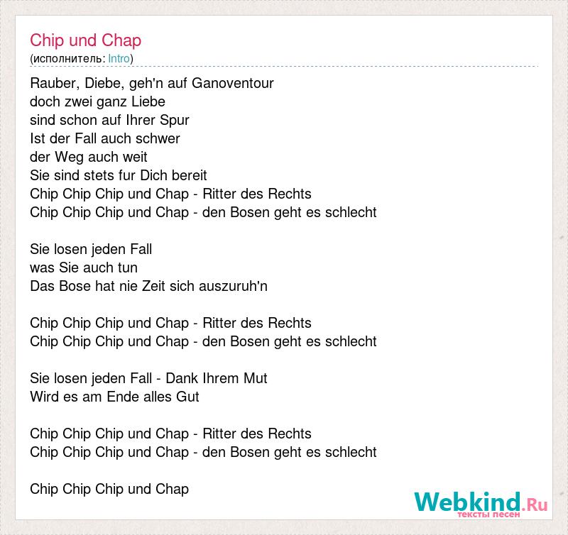 Rauber, Diebe, geh'n auf Ganoventour doch zwei ganz Liebe sind schon auf Ihrer Spur Ist der Fall auch schwer der Weg auch weit Sie sind stets fur Dich bereit Chip Chip Chip und Chap - Ritter des Rechts Chip Chip Chip und Chap - den Bosen geht es schlecht Sie losen jeden Fall was Sie auch tun Das Bose hat nie Zeit sich auszuruh'n Chip Chip Chip und Chap - Ritter des Rechts Chip Chip Chip und Chap - den Bosen geht es schlecht Sie losen jeden Fall - Dank Ihrem Mut Wird es am Ende alles Gut Chip Chip Chip und Chap - Ritter des Rechts Chip Chip Chip und Chap - den Bosen geht es schlecht Chip Chip Chip und Chap