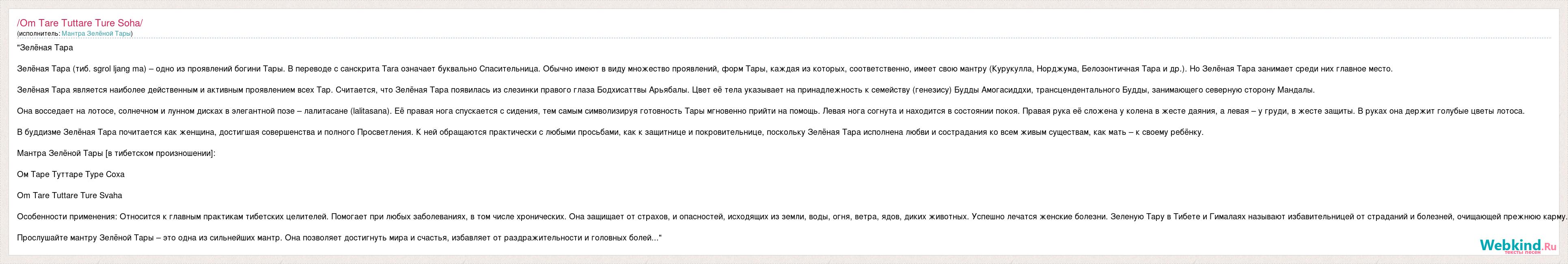 "Зелёная Тара Зелёная Тара (тиб. sgrol ljang ma) – одно из проявлений богини Тары. В переводе с санскрита Tara означает буквально Спасительница. Обычно имеют в виду множество проявлений, форм Тары, каждая из которых, соответственно, имеет свою мантру (Курукулла, Норджума, Белозонтичная Тара и др.). Но Зелёная Тара занимает среди них главное место. Зелёная Тара является наиболее действенным и активным проявлением всех Тар. Считается, что Зелёная Тара появилась из слезинки правого глаза Бодхисаттвы Арьябалы. Цвет её тела указывает на принадлежность к семейству (генезису) Будды Амогасиддхи, трансцендентального Будды, занимающего северную сторону Мандалы. Она восседает на лотосе, солнечном и лунном дисках в элегантной позе – лалитасане (lalitasana). Её правая нога спускается с сидения, тем самым символизируя готовность Тары мгновенно прийти на помощь. Левая нога согнута и находится в состоянии покоя. Правая рука её сложена у колена в жесте даяния, а левая – у груди, в жесте защиты. В руках она держит голубые цветы лотоса. В буддизме Зелёная Тара почитается как женщина, достигшая совершенства и полного Просветления. К ней обращаются практически с любыми просьбами, как к защитнице и покровительнице, поскольку Зелёная Тара исполнена любви и сострадания ко всем живым существам, как мать – к своему ребёнку. Мантра Зелёной Тары [в тибетском произношении]: Ом Таре Туттаре Туре Соха Om Tare Tuttare Ture Svaha Особенности применения: Относится к главным практикам тибетских целителей. Помогает при любых заболеваниях, в том числе хронических. Она защищает от страхов, и опасностей, исходящих из земли, воды, огня, ветра, ядов, диких животных. Успешно лечатся женские болезни. Зеленую Тару в Тибете и Гималаях называют избавительницей от страданий и болезней, очищающей прежнюю карму. Прослушайте мантру Зелёной Тары – это одна из сильнейших мантр. Она позволяет достигнуть мира и счастья, избавляет от раздражительности и головных болей..."