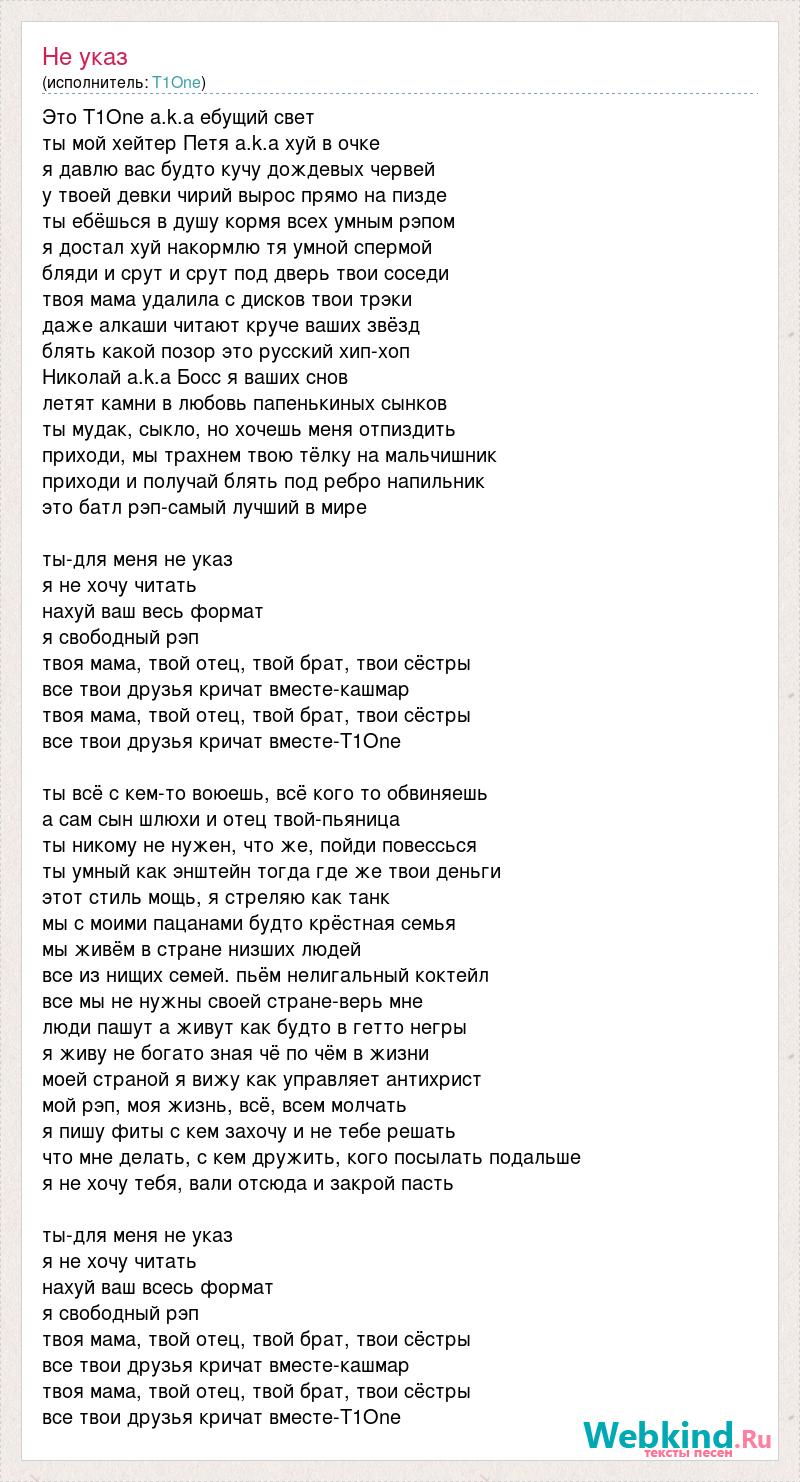 Это T1One a.k.a ебущий свет ты мой хейтер Петя a.k.a хуй в очке я давлю вас будто кучу дождевых червей у твоей девки чирий вырос прямо на пизде ты ебёшься в душу кормя всех умным рэпом я достал хуй накормлю тя умной спермой бляди и срут и срут под дверь твои соседи твоя мама удалила с дисков твои трэки даже алкаши читают круче ваших звёзд блять какой позор это русский хип-хоп Николай a.k.a Босс я ваших снов летят камни в любовь папенькиных сынков ты мудак, сыкло, но хочешь меня отпиздить приходи, мы трахнем твою тёлку на мальчишник приходи и получай блять под ребро напильник это батл рэп-самый лучший в мире ты-для меня не указ я не хочу читать нахуй ваш весь формат я свободный рэп твоя мама, твой отец, твой брат, твои сёстры все твои друзья кричат вместе-кашмар твоя мама, твой отец, твой брат, твои сёстры все твои друзья кричат вместе-T1One ты всё с кем-то воюешь, всё кого то обвиняешь а сам сын шлюхи и отец твой-пьяница ты никому не нужен, что же, пойди повессься ты умный как энштейн тогда где же твои деньги этот стиль мощь, я стреляю как танк мы с моими пацанами будто крёстная семья мы живём в стране низших людей все из нищих семей. пьём нелигальный коктейл все мы не нужны своей стране-верь мне люди пашут а живут как будто в гетто негры я живу не богато зная чё по чём в жизни моей страной я вижу как управляет антихрист мой рэп, моя жизнь, всё, всем молчать я пишу фиты с кем захочу и не тебе решать что мне делать, с кем дружить, кого посылать подальше я не хочу тебя, вали отсюда и закрой пасть ты-для меня не указ я не хочу читать нахуй ваш всесь формат я свободный рэп твоя мама, твой отец, твой брат, твои сёстры все твои друзья кричат вместе-кашмар твоя мама, твой отец, твой брат, твои сёстры все твои друзья кричат вместе-T1One
