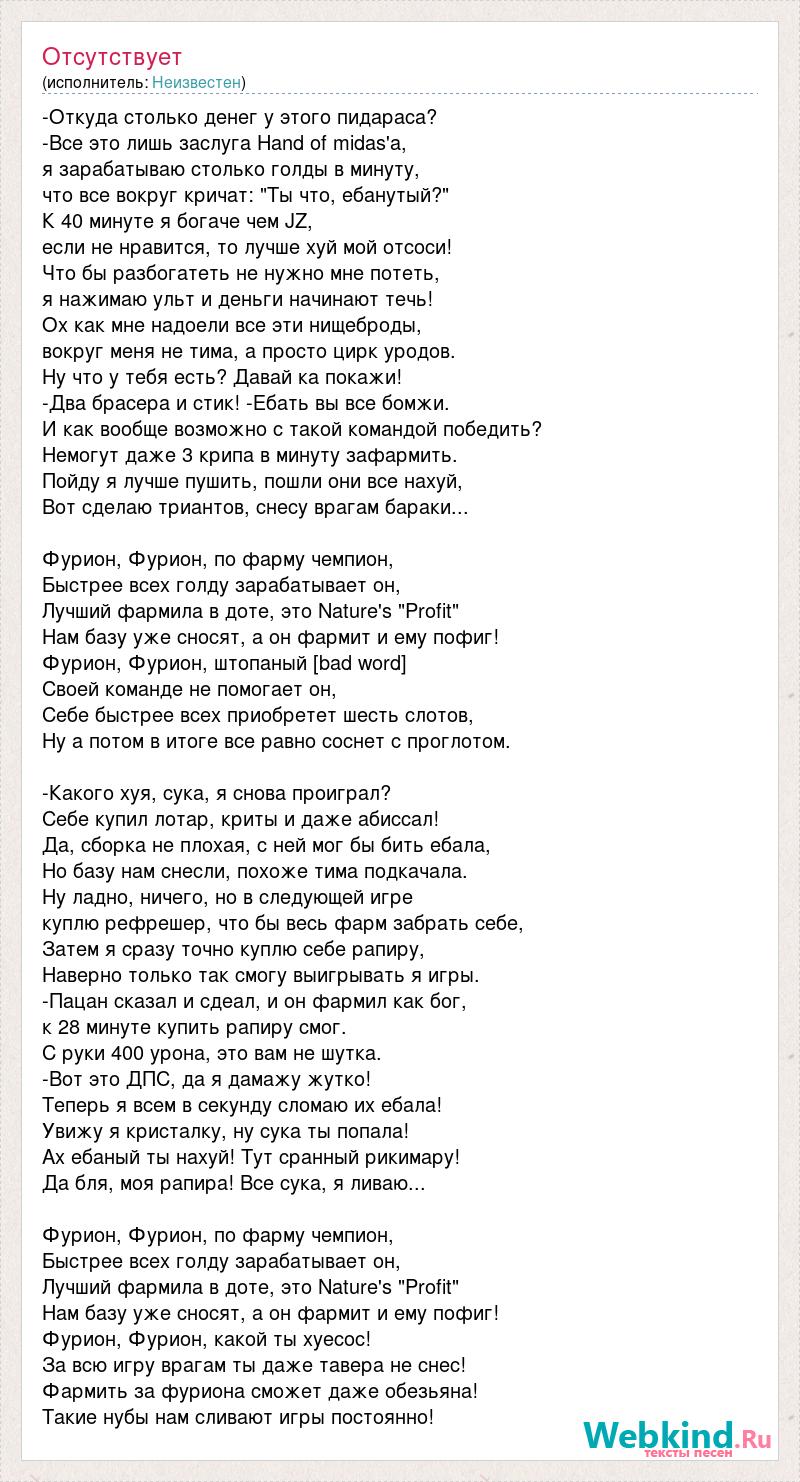 -Откуда столько денег у этого пидараса? -Все это лишь заслуга Hand of midas'a, я зарабатываю столько голды в минуту, что все вокруг кричат: "Ты что, ебанутый?" К 40 минуте я богаче чем JZ, если не нравится, то лучше хуй мой отсоси! Что бы разбогатеть не нужно мне потеть, я нажимаю ульт и деньги начинают течь! Ох как мне надоели все эти нищеброды, вокруг меня не тима, а просто цирк уродов. Ну что у тебя есть? Давай ка покажи! -Два брасера и стик! -Ебать вы все бомжи. И как вообще возможно с такой командой победить? Немогут даже 3 крипа в минуту зафармить. Пойду я лучше пушить, пошли они все нахуй, Вот сделаю триантов, снесу врагам бараки... Фурион, Фурион, по фарму чемпион, Быстрее всех голду зарабатывает он, Лучший фармила в доте, это Nature's "Profit" Нам базу уже сносят, а он фармит и ему пофиг! Фурион, Фурион, штопаный [bad word] Своей команде не помогает он, Себе быстрее всех приобретет шесть слотов, Ну а потом в итоге все равно соснет с проглотом. -Какого хуя, сука, я снова проиграл? Себе купил лотар, криты и даже абиссал! Да, сборка не плохая, с ней мог бы бить ебала, Но базу нам снесли, похоже тима подкачала. Ну ладно, ничего, но в следующей игре куплю рефрешер, что бы весь фарм забрать себе, Затем я сразу точно куплю себе рапиру, Наверно только так смогу выигрывать я игры. -Пацан сказал и сдеал, и он фармил как бог, к 28 минуте купить рапиру смог. С руки 400 урона, это вам не шутка. -Вот это ДПС, да я дамажу жутко! Теперь я всем в секунду сломаю их ебала! Увижу я кристалку, ну сука ты попала! Ах ебаный ты нахуй! Тут сранный рикимару! Да бля, моя рапира! Все сука, я ливаю... Фурион, Фурион, по фарму чемпион, Быстрее всех голду зарабатывает он, Лучший фармила в доте, это Nature's "Profit" Нам базу уже сносят, а он фармит и ему пофиг! Фурион, Фурион, какой ты хуесос! За всю игру врагам ты даже тавера не снес! Фармить за фуриона сможет даже обезьяна! Такие нубы нам сливают игры постоянно!