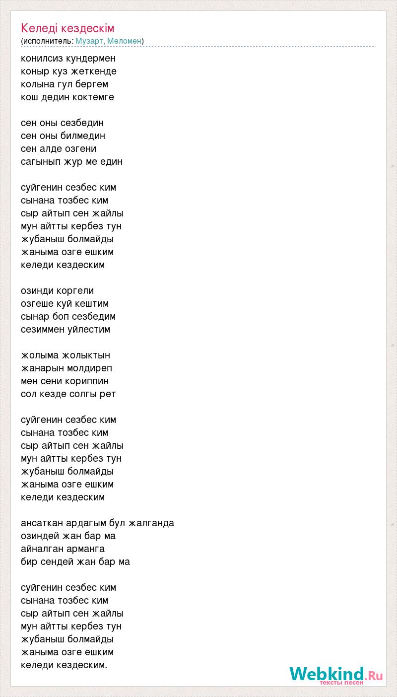 конилсиз кундермен коныр куз жеткенде колына гул бергем кош дедин коктемге сен оны сезбедин сен оны билмедин сен алде озгени сагынып жур ме един суйгенин сезбес ким сынана тозбес ким сыр айтып сен жайлы мун айтты кербез тун жубаныш болмайды жаныма озге ешким келеди кездеским озинди коргели озгеше куй кештим сынар боп сезбедим сезиммен уйлестим жолыма жолыктын жанарын молдиреп мен сени кориппин сол кезде солгы рет суйгенин сезбес ким сынана тозбес ким сыр айтып сен жайлы мун айтты кербез тун жубаныш болмайды жаныма озге ешким келеди кездеским ансаткан ардагым бул жалганда озиндей жан бар ма айналган арманга бир сендей жан бар ма суйгенин сезбес ким сынана тозбес ким сыр айтып сен жайлы мун айтты кербез тун жубаныш болмайды жаныма озге ешким келеди кездеским.