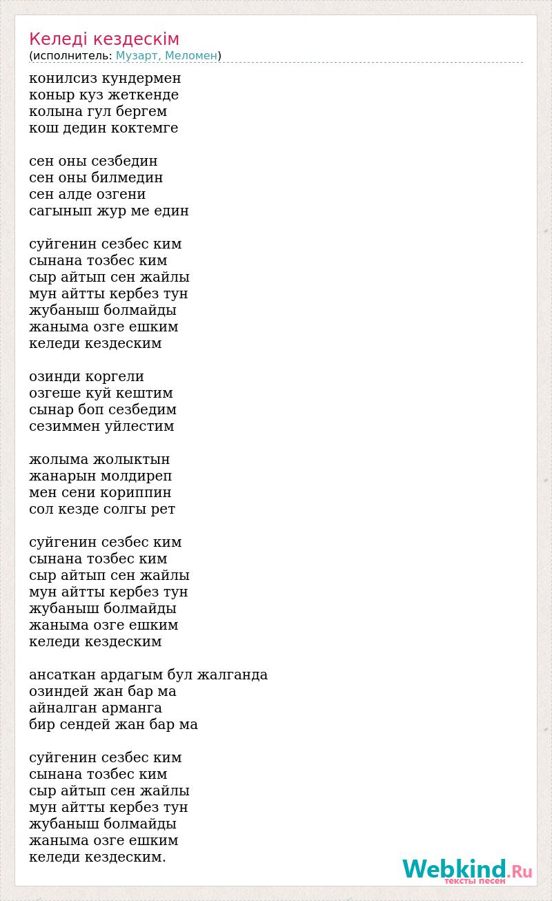конилсиз кундермен коныр куз жеткенде колына гул бергем кош дедин коктемге сен оны сезбедин сен оны билмедин сен алде озгени сагынып жур ме един суйгенин сезбес ким сынана тозбес ким сыр айтып сен жайлы мун айтты кербез тун жубаныш болмайды жаныма озге ешким келеди кездеским озинди коргели озгеше куй кештим сынар боп сезбедим сезиммен уйлестим жолыма жолыктын жанарын молдиреп мен сени кориппин сол кезде солгы рет суйгенин сезбес ким сынана тозбес ким сыр айтып сен жайлы мун айтты кербез тун жубаныш болмайды жаныма озге ешким келеди кездеским ансаткан ардагым бул жалганда озиндей жан бар ма айналган арманга бир сендей жан бар ма суйгенин сезбес ким сынана тозбес ким сыр айтып сен жайлы мун айтты кербез тун жубаныш болмайды жаныма озге ешким келеди кездеским.