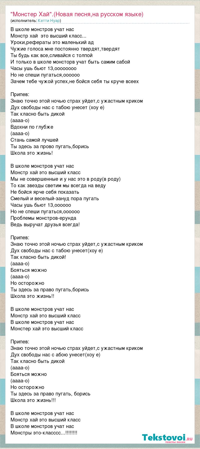 В школе монстров учат нас Монстр хай это высший класс... Уроки,рефераты это маленький ад Чужие голоса мне постоянно твердят,твердят Ты будь как все,сливайся с толпой И только в школе монсторв учат быть самим сабой Часы ушь бьют 13,оооооооо Но не спеши пугаться,оооооо Зачем тебе чужой успех,не бойся себя ты круче всеех Припев: Знаю точно этой ночью страх уйдет,с ужастным криком Дух свободы нас с табою унесет (хоу е) Так класно быть дикой (аааа-о) Вдохни по глубже (аааа-о) Стань самой лучшей Ты здесь за прово пугать,борись Школа это жизнь! В школе монстров учат нас Монстр хай это высший класс Мы не совершенные и у нас это в роду(в роду) То как звезды светим мы всегда на веду Не бойся ярче себя показать Смелый и веселый-зануд пора пугать Часы ушь бьют 13,оооооо Но не спеши пугаться,оооооо Проблемы монстров-ерунда Ведь выручат друзья всегда! Припев: Знаю точно этой ночью страх уйдет,с ужастным криком Дух свободы нас с табою унесет(хоу е) Так класно быть дикой! (аааа-о) Бояться можно (аааа-о) Но осторожно Ты здесь за право пугать,борись Школа это жизнь!! В школе монстров учат нас Монстр хай это высший класс В школе монстров учат нас Монстер хай это высший класс Припев: Знаю точно этой ночью страх уйдет,с ужастным криком Дух свободы нас с абою унесет(хоу е) Так класно быть дикой (аааа-о) Бояться можно (аааа-о) Но осторожно Ты здесь за право пугать, борись Школа это жизнь!!! В школе монстров учат нас Монстр хай это высший класс В школе монстров учат нас Монстры это-класссс...!!!!!!!!