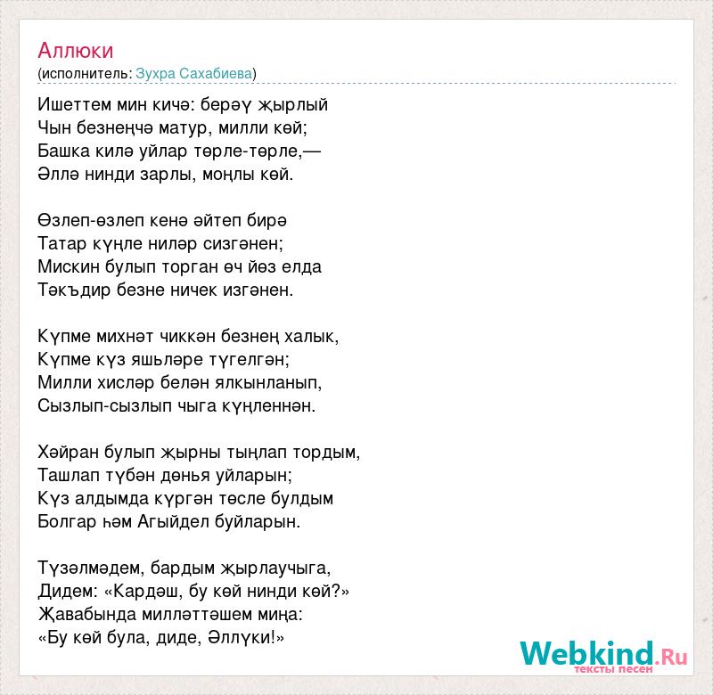 Ишеттем мин кичә: берәү җырлый Чын безнеңчә матур, милли көй; Башка килә уйлар төрле-төрле,— Әллә нинди зарлы, моңлы көй. Өзлеп-өзлеп кенә әйтеп бирә Татар күңле ниләр сизгәнен; Мискин булып торган өч йөз елда Тәкъдир безне ничек изгәнен. Күпме михнәт чиккән безнең халык, Күпме күз яшьләре түгелгән; Милли хисләр белән ялкынланып, Сызлып-сызлып чыга күңленнән. Хәйран булып җырны тыңлап тордым, Ташлап түбән дөнья уйларын; Күз алдымда күргән төсле булдым Болгар һәм Агыйдел буйларын. Түзәлмәдем, бардым җырлаучыга, Дидем: «Кардәш, бу көй нинди көй?» Җавабында милләттәшем миңа: «Бу көй була, диде, Әллүки!»