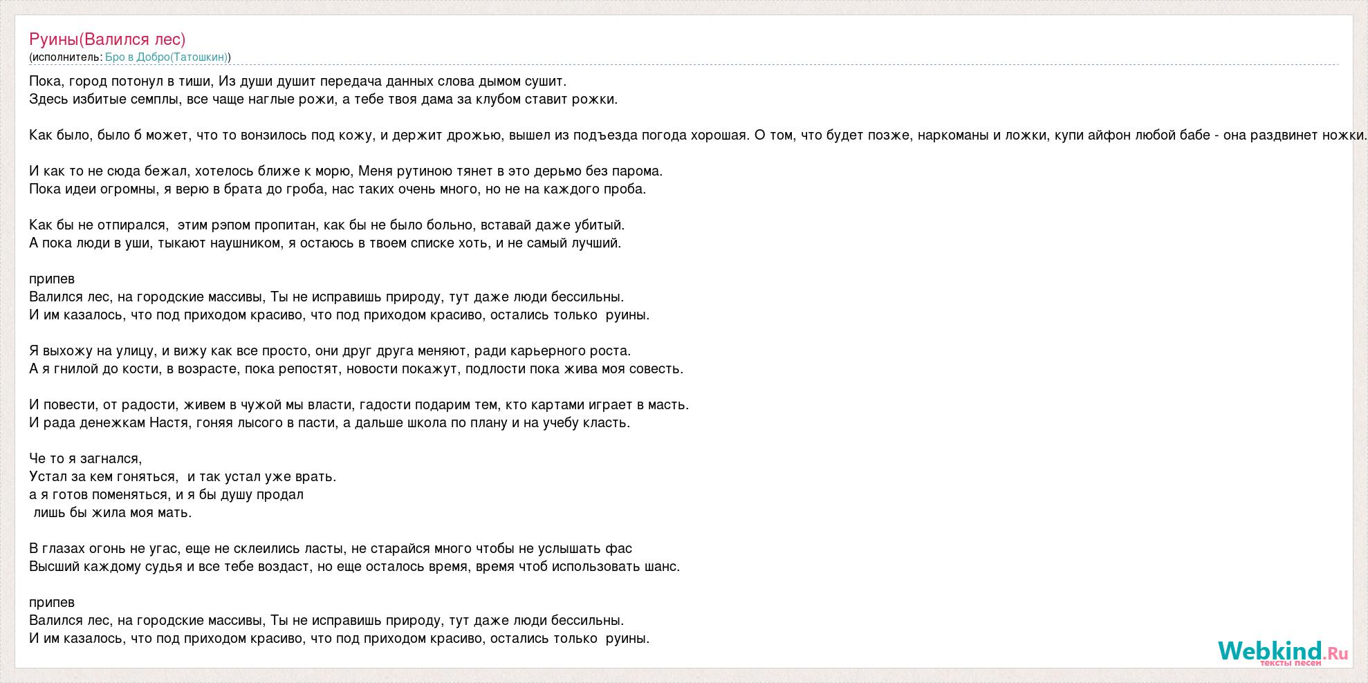 Пока, город потонул в тиши, Из души душит передача данных слова дымом сушит. Здесь избитые семплы, все чаще наглые рожи, а тебе твоя дама за клубом ставит рожки. Как было, было б может, что то вонзилось под кожу, и держит дрожью, вышел из подъезда погода хорошая. О том, что будет позже, наркоманы и ложки, купи айфон любой бабе - она раздвинет ножки. И как то не сюда бежал, хотелось ближе к морю, Меня рутиною тянет в это дерьмо без парома. Пока идеи огромны, я верю в брата до гроба, нас таких очень много, но не на каждого проба. Как бы не отпирался, этим рэпом пропитан, как бы не было больно, вставай даже убитый. А пока люди в уши, тыкают наушником, я остаюсь в твоем списке хоть, и не самый лучший. припев Валился лес, на городские массивы, Ты не исправишь природу, тут даже люди бессильны. И им казалось, что под приходом красиво, что под приходом красиво, остались только руины. Я выхожу на улицу, и вижу как все просто, они друг друга меняют, ради карьерного роста. А я гнилой до кости, в возрасте, пока репостят, новости покажут, подлости пока жива моя совесть. И повести, от радости, живем в чужой мы власти, гадости подарим тем, кто картами играет в масть. И рада денежкам Настя, гоняя лысого в пасти, а дальше школа по плану и на учебу класть. Че то я загнался, Устал за кем гоняться, и так устал уже врать. а я готов поменяться, и я бы душу продал лишь бы жила моя мать. В глазах огонь не угас, еще не склеились ласты, не старайся много чтобы не услышать фас Высший каждому судья и все тебе воздаст, но еще осталось время, время чтоб использовать шанс. припев Валился лес, на городские массивы, Ты не исправишь природу, тут даже люди бессильны. И им казалось, что под приходом красиво, что под приходом красиво, остались только руины.