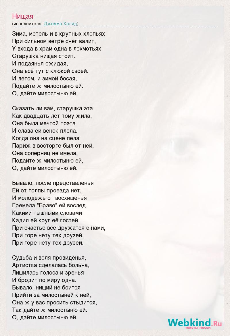 Зима, метель и в крупных хлопьях При сильном ветре снег валит, У входа в храм одна в лохмотьях Старушка нищая стоит. И подаянья ожидая, Она всё тут с клюкой своей. И летом, и зимой босая, Подайте ж милостыню ей. О, дайте милостыню ей. Сказать ли вам, старушка эта Как двадцать лет тому жила, Она была мечтой поэта И слава ей венок плела. Когда она на сцене пела Париж в восторге был от ней, Она соперниц не имела, Подайте ж милостыню ей, О, дайте милостыню ей. Бывало, после представленья Ей от толпы проезда нет, И молодежь от восхищенья Гремела "Браво" ей вослед. Какими пышными словами Кадил ей круг её гостей. При счастье все дружатся с нами, При горе нету тех друзей. При горе нету тех друзей. Судьба и воля провиденья, Артистка сделалась больна, Лишилась голоса и зренья И бродит по миру одна. Бывало, нищий не боится Прийти за милостыней к ней, Она ж у вас просить стыдится, Так дайте ж милостыню ей. О, дайте милостыню ей.
