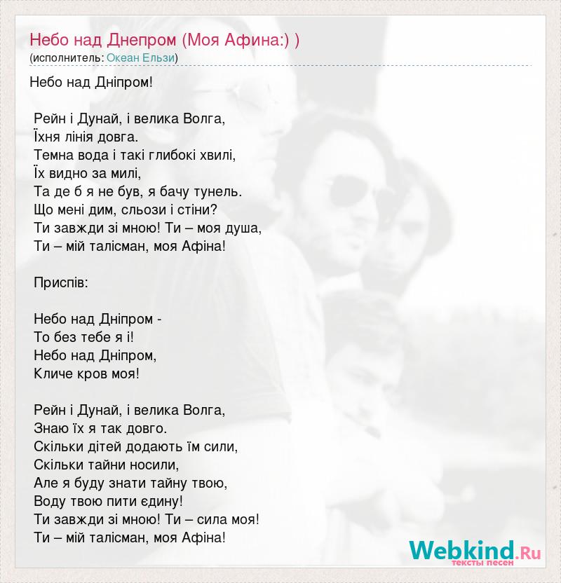Небо над Днiпром! Рейн i Дунай, i велика Волга, Їхня лiнiя довга. Темна вода i такi глибокi хвилi, Їх видно за милi, Та де б я не був, я бачу тунель. Що менi дим, сльози i стiни? Ти завжди зi мною! Ти – моя душа, Ти – мiй талiсман, моя Афiна! Приспiв: Небо над Днiпром - То без тебе я i! Небо над Днiпром, Кличе кров моя! Рейн i Дунай, i велика Вoлга, Знаю їх я так довго. Скiльки дiтей додають їм сили, Скiльки тайни носили, Але я буду знати тайну твою, Воду твою пити єдину! Ти завжди зi мною! Ти – сила моя! Ти – мiй талiсман, моя Афiна!
