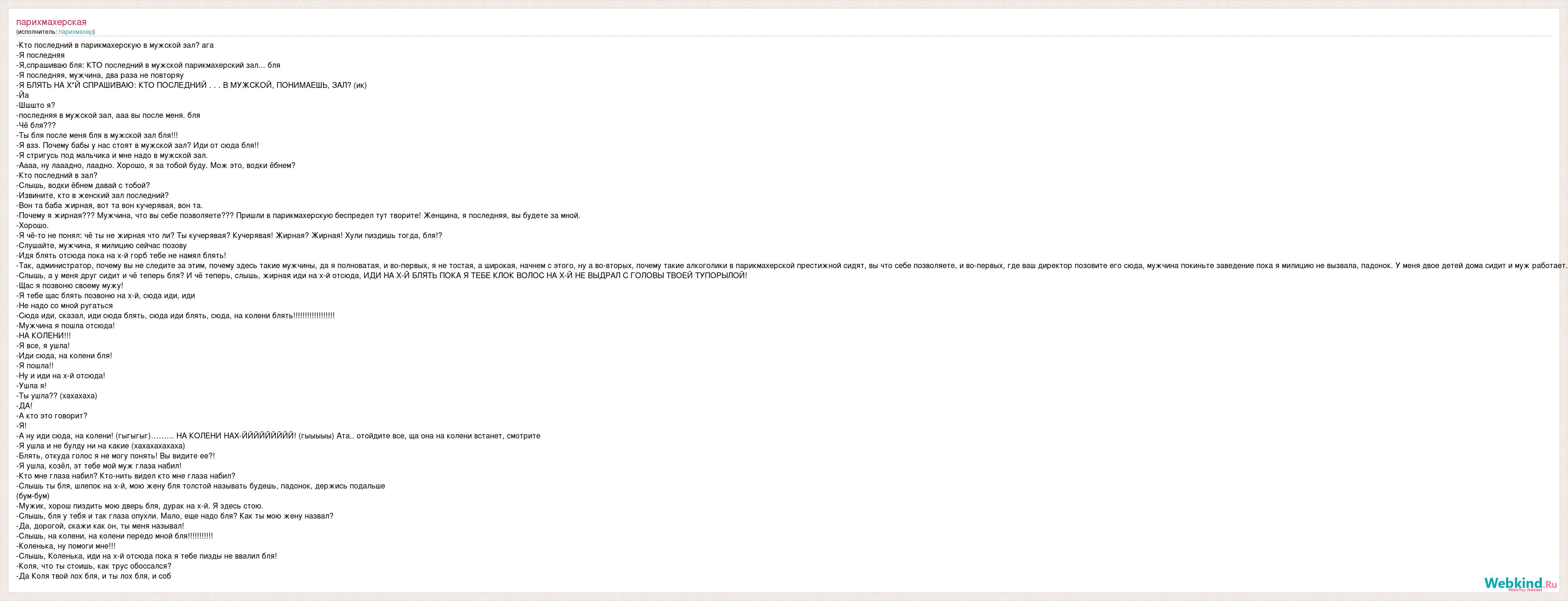 -Кто последний в парикмахерскую в мужской зал? ага -Я последняя -Я,спрашиваю бля: КТО последний в мужской парикмахерский зал... бля -Я последняя, мужчина, два раза не повторяу -Я БЛЯТЬ НА Х*Й СПРАШИВАЮ: КТО ПОСЛЕДНИЙ . . . В МУЖСКОЙ, ПОНИМАЕШЬ, ЗАЛ? (ик) -Йа -Шшшто я? -последняя в мужской зал, ааа вы после меня. бля -Чё бля??? -Ты бля после меня бля в мужской зал бля!!! -Я взз. Почему бабы у нас стоят в мужской зал? Иди от сюда бля!! -Я стригусь под мальчика и мне надо в мужской зал. -Аааа, ну лааадно, лаадно. Хорошо, я за тобой буду. Мож это, водки ёбнем? -Кто последний в зал? -Слышь, водки ёбнем давай с тобой? -Извините, кто в женский зал последний? -Вон та баба жирная, вот та вон кучерявая, вон та. -Почему я жирная??? Мужчина, что вы себе позволяете??? Пришли в парикмахерскую беспредел тут творите! Женщина, я последняя, вы будете за мной. -Хорошо. -Я чё-то не понял: чё ты не жирная что ли? Ты кучерявая? Кучерявая! Жирная? Жирная! Хули пиздишь тогда, бля!? -Слушайте, мужчина, я милицию сейчас позову -Идя блять отсюда пока на х-й горб тебе не намял блять! -Так, администратор, почему вы не следите за этим, почему здесь такие мужчины, да я полноватая, и во-первых, я не тостая, а широкая, начнем с этого, ну а во-вторых, почему такие алкоголики в парикмахерской престижной сидят, вы что себе позволяете, и во-первых, где ваш директор позовите его сюда, мужчина покиньте заведение пока я милицию не вызвала, падонок. У меня двое детей дома сидит и муж работает. -Слышь, а у меня друг сидит и чё теперь бля? И чё теперь, слышь, жирная иди на х-й отсюда, ИДИ НА Х-Й БЛЯТЬ ПОКА Я ТЕБЕ КЛОК ВОЛОС НА Х-Й НЕ ВЫДРАЛ С ГОЛОВЫ ТВОЕЙ ТУПОРЫЛОЙ! -Щас я позвоню своему мужу! -Я тебе щас блять позвоню на х-й, сюда иди, иди -Не надо со мной ругаться -Сюда иди, сказал, иди сюда блять, сюда иди блять, сюда, на колени блять!!!!!!!!!!!!!!!!!! -Мужчина я пошла отсюда! -НА КОЛЕНИ!!! -Я все, я ушла! -Иди сюда, на колени бля! -Я пошла!! -Ну и иди на х-й отсюда! -Ушла я! -Ты ушла?? (хахахаха) -ДА! -А кто это говорит? -Я! -А ну иди сюда, на колени! (гыгыгыг)……… НА КОЛЕНИ НАХ-ЙЙЙЙЙЙЙЙЙ! (гыыыыы) Ата.. отойдите все, ща она на колени встанет, смотрите -Я ушла и не булду ни на какие (хахахахахаха) -Блять, откуда голос я не могу понять! Вы видите ее?! -Я ушла, козёл, эт тебе мой муж глаза набил! -Кто мне глаза набил? Кто-нить видел кто мне глаза набил? -Слышь ты бля, шлепок на х-й, мою жену бля толстой называть будешь, падонок, держись подальше (бум-бум) -Мужик, хорош пиздить мою дверь бля, дурак на х-й. Я здесь стою. -Слышь, бля у тебя и так глаза опухли. Мало, еще надо бля? Как ты мою жену назвал? -Да, дорогой, скажи как он, ты меня называл! -Слышь, на колени, на колени передо мной бля!!!!!!!!!!! -Коленька, ну помоги мне!!! -Слышь, Коленька, иди на х-й отсюда пока я тебе пизды не ввалил бля! -Коля, что ты стоишь, как трус обоссался? -Да Коля твой лох бля, и ты лох бля, и соб
