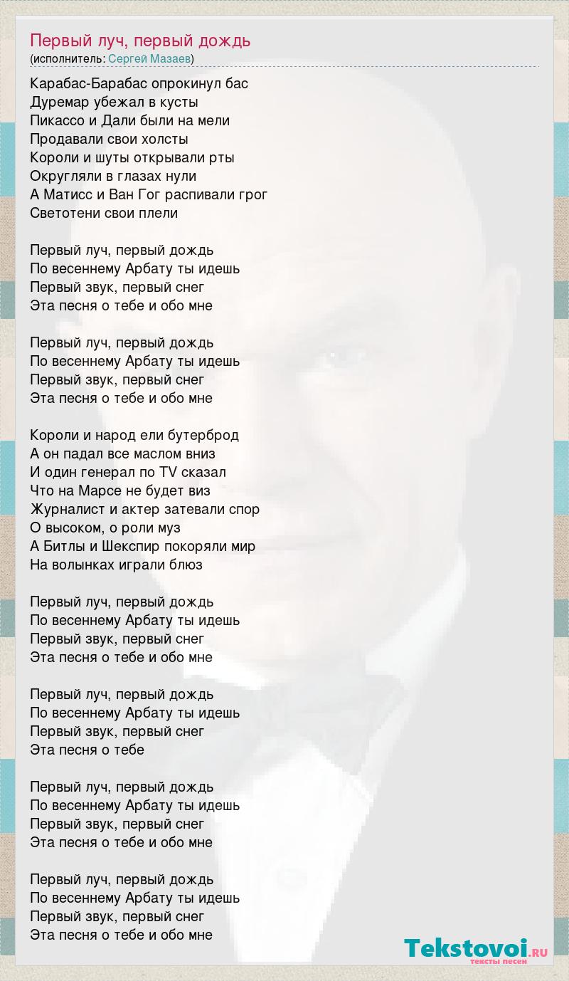 Карабас-Барабас опрокинул бас Дуремар убежал в кусты Пикассо и Дали были на мели Продавали свои холсты Короли и шуты открывали рты Округляли в глазах нули А Матисс и Ван Гог распивали грог Светотени свои плели Первый луч, первый дождь По весеннему Арбату ты идешь Первый звук, первый снег Эта песня о тебе и обо мне Первый луч, первый дождь По весеннему Арбату ты идешь Первый звук, первый снег Эта песня о тебе и обо мне Короли и народ ели бутерброд А он падал все маслом вниз И один генерал по TV сказал Что на Марсе не будет виз Журналист и актер затевали спор О высоком, о роли муз А Битлы и Шекспир покоряли мир На волынках играли блюз Первый луч, первый дождь По весеннему Арбату ты идешь Первый звук, первый снег Эта песня о тебе и обо мне Первый луч, первый дождь По весеннему Арбату ты идешь Первый звук, первый снег Эта песня о тебе Первый луч, первый дождь По весеннему Арбату ты идешь Первый звук, первый снег Эта песня о тебе и обо мне Первый луч, первый дождь По весеннему Арбату ты идешь Первый звук, первый снег Эта песня о тебе и обо мне