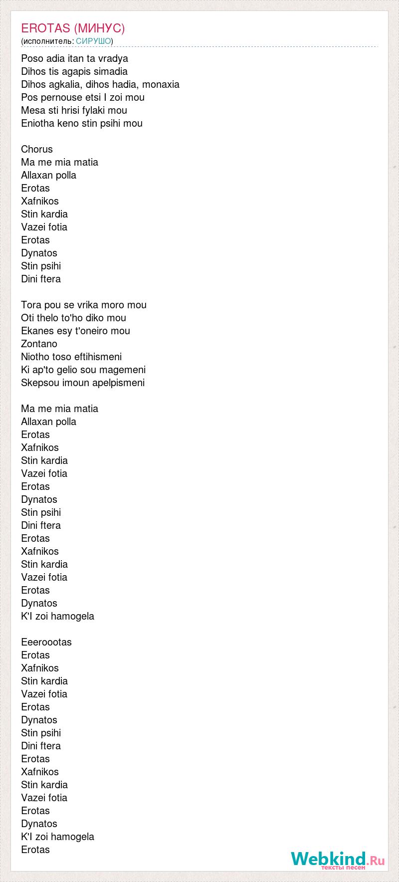 Poso adia itan ta vradya Dihos tis agapis simadia Dihos agkalia, dihos hadia, monaxia Pos pernouse etsi I zoi mou Mesa sti hrisi fylaki mou Eniotha keno stin psihi mou Chorus Ma me mia matia Allaxan polla Erotas Xafnikos Stin kardia Vazei fotia Erotas Dynatos Stin psihi Dini ftera Tora pou se vrika moro mou Oti thelo to'ho diko mou Ekanes esy t'oneiro mou Zontano Niotho toso eftihismeni Ki ap'to gelio sou magemeni Skepsou imoun apelpismeni Ma me mia matia Allaxan polla Erotas Xafnikos Stin kardia Vazei fotia Erotas Dynatos Stin psihi Dini ftera Erotas Xafnikos Stin kardia Vazei fotia Erotas Dynatos K'I zoi hamogela Eeeroootas Erotas Xafnikos Stin kardia Vazei fotia Erotas Dynatos Stin psihi Dini ftera Erotas Xafnikos Stin kardia Vazei fotia Erotas Dynatos K'I zoi hamogela Erotas