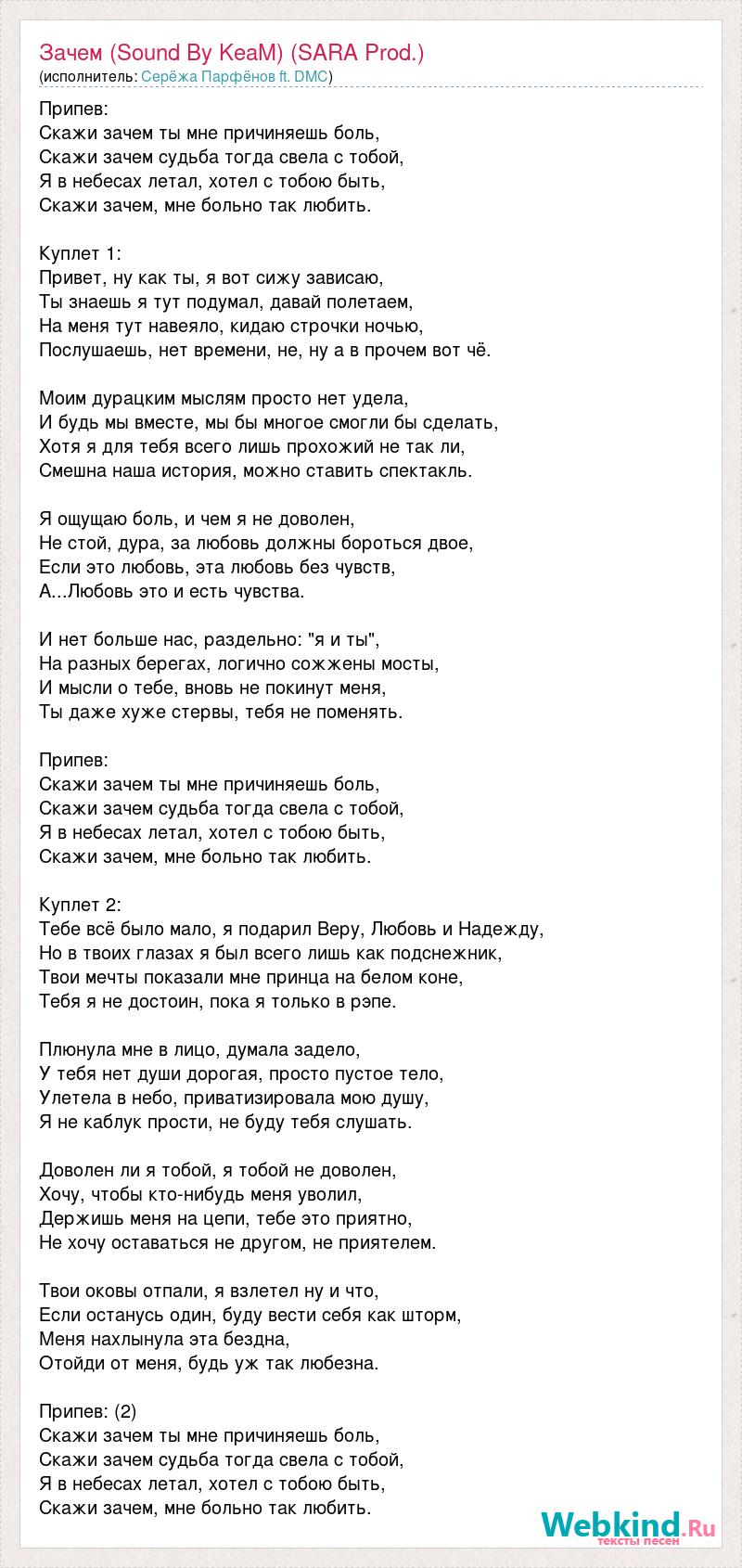 Припев: Скажи зачем ты мне причиняешь боль, Скажи зачем судьба тогда свела с тобой, Я в небесах летал, хотел с тобою быть, Скажи зачем, мне больно так любить. Куплет 1: Привет, ну как ты, я вот сижу зависаю, Ты знаешь я тут подумал, давай полетаем, На меня тут навеяло, кидаю строчки ночью, Послушаешь, нет времени, не, ну а в прочем вот чё. Моим дурацким мыслям просто нет удела, И будь мы вместе, мы бы многое смогли бы сделать, Хотя я для тебя всего лишь прохожий не так ли, Смешна наша история, можно ставить спектакль. Я ощущаю боль, и чем я не доволен, Не стой, дура, за любовь должны бороться двое, Если это любовь, эта любовь без чувств, А...Любовь это и есть чувства. И нет больше нас, раздельно: "я и ты", На разных берегах, логично сожжены мосты, И мысли о тебе, вновь не покинут меня, Ты даже хуже стервы, тебя не поменять. Припев: Скажи зачем ты мне причиняешь боль, Скажи зачем судьба тогда свела с тобой, Я в небесах летал, хотел с тобою быть, Скажи зачем, мне больно так любить. Куплет 2: Тебе всё было мало, я подарил Веру, Любовь и Надежду, Но в твоих глазах я был всего лишь как подснежник, Твои мечты показали мне принца на белом коне, Тебя я не достоин, пока я только в рэпе. Плюнула мне в лицо, думала задело, У тебя нет души дорогая, просто пустое тело, Улетела в небо, приватизировала мою душу, Я не каблук прости, не буду тебя слушать. Доволен ли я тобой, я тобой не доволен, Хочу, чтобы кто-нибудь меня уволил, Держишь меня на цепи, тебе это приятно, Не хочу оставаться не другом, не приятелем. Твои оковы отпали, я взлетел ну и что, Если останусь один, буду вести себя как шторм, Меня нахлынула эта бездна, Отойди от меня, будь уж так любезна. Припев: (2) Скажи зачем ты мне причиняешь боль, Скажи зачем судьба тогда свела с тобой, Я в небесах летал, хотел с тобою быть, Скажи зачем, мне больно так любить.