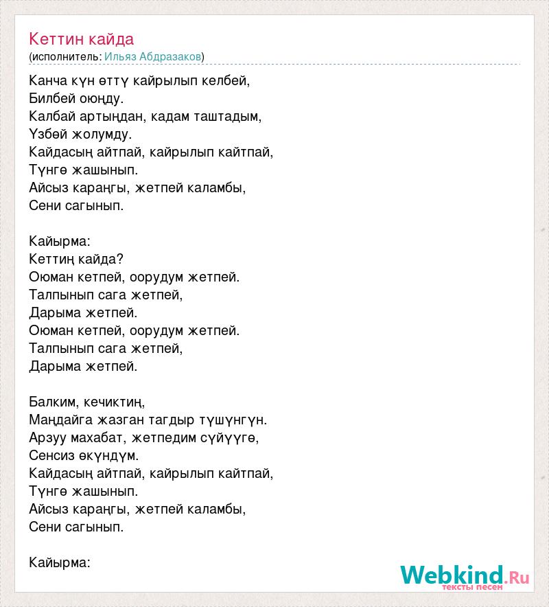 Канча күн өттү кайрылып келбей, Билбей оюңду. Калбай артыңдан, кадам таштадым, Үзбөй жолумду. Кайдасың айтпай, кайрылып кайтпай, Түнгө жашынып. Айсыз караңгы, жетпей каламбы, Сени сагынып. Кайырма: Кеттиң кайда? Оюман кетпей, оорудум жетпей. Талпынып сага жетпей, Дарыма жетпей. Оюман кетпей, оорудум жетпей. Талпынып сага жетпей, Дарыма жетпей. Балким, кечиктиң, Маңдайга жазган тагдыр түшүнгүн. Арзуу махабат, жетпедим сүйүүгө, Сенсиз өкүндүм. Кайдасың айтпай, кайрылып кайтпай, Түнгө жашынып. Айсыз караңгы, жетпей каламбы, Сени сагынып. Кайырма: