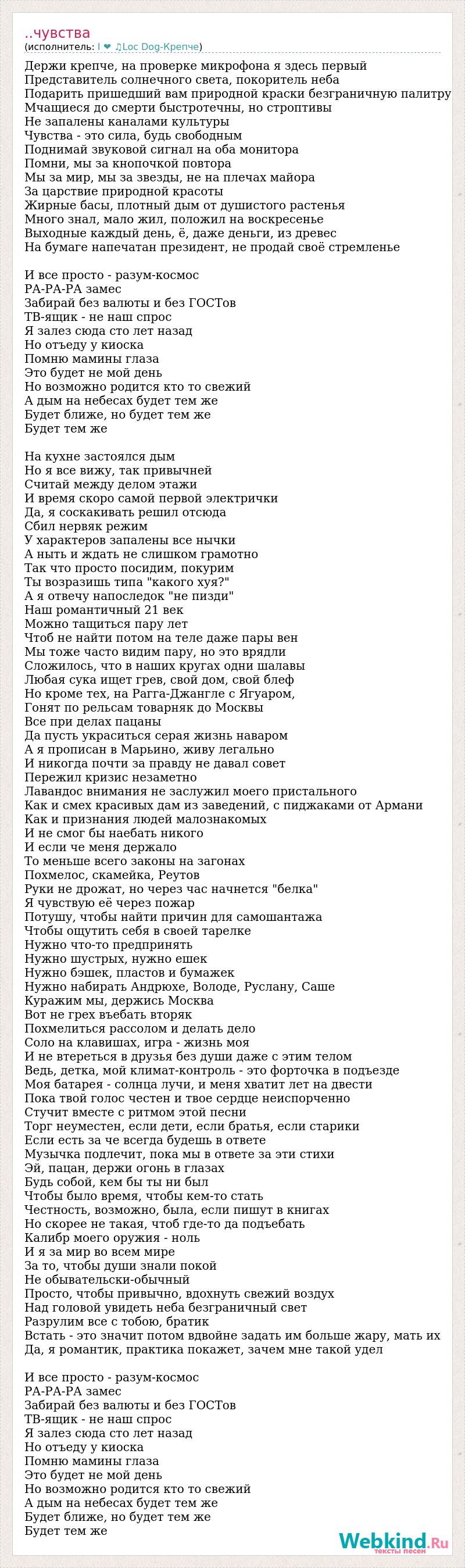 Держи крепче, на проверке микрофона я здесь первый Представитель солнечного света, покоритель неба Подарить пришедший вам природной краски безграничную палитру Мчащиеся до смерти быстротечны, но строптивы Не запалены каналами культуры Чувства - это сила, будь свободным Поднимай звуковой сигнал на оба монитора Помни, мы за кнопочкой повтора Мы за мир, мы за звезды, не на плечах майора За царствие природной красоты Жирные басы, плотный дым от душистого растенья Много знал, мало жил, положил на воскресенье Выходные каждый день, ё, даже деньги, из древес На бумаге напечатан президент, не продай своё стремленье И все просто - разум-космос РА-РА-РА замес Забирай без валюты и без ГОСТов ТВ-ящик - не наш спрос Я залез сюда сто лет назад Но отъеду у киоска Помню мамины глаза Это будет не мой день Но возможно родится кто то свежий А дым на небесах будет тем же Будет ближе, но будет тем же Будет тем же На кухне застоялся дым Но я все вижу, так привычней Считай между делом этажи И время скоро самой первой электрички Да, я соскакивать решил отсюда Сбил нервяк режим У характеров запалены все нычки А ныть и ждать не слишком грамотно Так что просто посидим, покурим Ты возразишь типа "какого хуя?" А я отвечу напоследок "не пизди" Наш романтичный 21 век Можно тащиться пару лет Чтоб не найти потом на теле даже пары вен Мы тоже часто видим пару, но это врядли Сложилось, что в наших кругах одни шалавы Любая сука ищет грев, свой дом, свой блеф Но кроме тех, на Рагга-Джангле с Ягуаром, Гонят по рельсам товарняк до Москвы Все при делах пацаны Да пусть украситься серая жизнь наваром А я прописан в Марьино, живу легально И никогда почти за правду не давал совет Пережил кризис незаметно Лавандос внимания не заслужил моего пристального Как и смех красивых дам из заведений, с пиджаками от Армани Как и признания людей малознакомых И не смог бы наебать никого И если че меня держало То меньше всего законы на загонах Похмелос, скамейка, Реутов Руки не дрожат, но через час начнется "белка" Я чувствую её через пожар Потушу, чтобы найти причин для самошантажа Чтобы ощутить себя в своей тарелке Нужно что-то предпринять Нужно шустрых, нужно ешек Нужно бэшек, пластов и бумажек Нужно набирать Андрюхе, Володе, Руслану, Саше Куражим мы, держись Москва Вот не грех въебать вторяк Похмелиться рассолом и делать дело Соло на клавишах, игра - жизнь моя И не втереться в друзья без души даже с этим телом Ведь, детка, мой климат-контроль - это форточка в подъезде Моя батарея - солнца лучи, и меня хватит лет на двести Пока твой голос честен и твое сердце неиспорченно Стучит вместе с ритмом этой песни Торг неуместен, если дети, если братья, если старики Если есть за че всегда будешь в ответе Музычка подлечит, пока мы в ответе за эти стихи Эй, пацан, держи огонь в глазах Будь собой, кем бы ты ни был Чтобы было время, чтобы кем-то стать Честность, возможно, была, если пишут в книгах Но скорее не такая, чтоб где-то да подъебать Калибр моего оружия - ноль И я за мир во всем мире За то, чтобы души знали покой Не обывательски-обычный Просто, чтобы привычно, вдохнуть свежий воздух Над головой увидеть неба безграничный свет Разрулим все с тобою, братик Встать - это значит потом вдвойне задать им больше жару, мать их Да, я романтик, практика покажет, зачем мне такой удел И все просто - разум-космос РА-РА-РА замес Забирай без ва