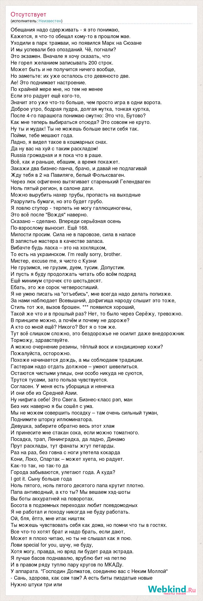 Обещания надо сдерживать - я это понимаю, Кажется, я что-то обещал кому-то в прошлом мае. Уходили в парк трамваи, но появился Марк на Сюзане И мы успевали без опозданий. Чё, погнали? Это экзамен. Вначале я хочу сказать, что Не горел желанием записывать 200 строк. Может быть и не получится ничего вообще, Но заметьте: их уже осталось сто девяносто две. Ае! Это поднимает настроение. По крайней мере мне, но тем не менее Если это радует ещё кого-то, Значит это уже что-то больше, чем просто игра в одни ворота. Доброе утро, бодрая пудра, долгая мутка, тонкая куртка, После 4-го парашюта понимаю смутно: Это что, Бутово? Как мне теперь выбираться отсюда? Это совсем не круто. Ну ты и мудак! Ты не можешь больше вести себя так. Пойми, тебе мешают года. Ладно, я видел такое в кошмарных снах. Да ну вас на хуй с таким раскладом! Russia громадная и я пока что в раше. Всё, как и раньше, ебашим, а время покажет. Закажи два бизнес-ланча, брачо, и давай не подлагивай Жду тебя в 2 на Павиляге, белый Фольксваген. Через люк офигенно вытягивает старенький Гелендваген Ноль пятый регион, в салоне даги. Можно вырубить нахер трубы, пропасть на выходные Разрулить бумаги, но это будет грубо. Я ловлю ступор - терпеть не могу галлюциногены, Это всё после "Вождя" наверно. Сказано – сделано. Впереди серьёзная осень По-взрослому выносит. Ещё 168. Милости просим. Сила не в паровозе, сила в напасе В запястье мастера в качестве запаса. Вибачте будь ласка – это на хохляцком, То есть на украинском. I’m really sorry, brother. Мистер, excuse me, я чисто с Кузни Не грузимся, не грузим, дуем, тусим. Допустим. И пусть я буду продолжать читать обо всём подряд Ещё минимум строчек сто шестьдесят. Ебать, это же сорок четверостиший. Я не умею писать на "отъебись", мне всегда надо делать попизже. За нами наблюдает Всевышний, дофигища народу слышит это тоже, Стиль тот же, вызов брошен. *** появился хороший, Такой же что и в прошлый раз? Нет, то было через Серёжу, тревожно. В принципе можно, а почём и почему не дороже? А кто со мной ещё? Никого? Вот я о том же. Тут всё слишком сложно, это бездорожье не осилит даже внедорожник Торможу, здравствуйте. А можно очернение резины, тёплый воск и кондиционер кожи? Пожалуйста, осторожно. Похоже начинается дождь, а мы соблюдаем традиции. Гастерам надо отдать должное – умеют шевелиться. Остаются чистыми улицы, они особо никуда не суются, Трутся тусами, зато польза чувствуется. Согласен. У меня есть уборщица и нянечка И они обе из Средней Азии. Ну нифига себе! Это Свега. Бизнес-класс рэп, ман Без них наверно я бы сошёл с ума. Мы не можем совершить посадку – там очень сильный туман, Поднимите шторку иллюминатора. Девушка, заберите обратно весь этот хлам И принесите мне стакан сока, если можно томатного. Посадка, трап, Ленинградка, да ладно, Динамо Прут расклады, тут фанаты жгут петарды. Раз на раз, без говна с ноги улетела кокарда Кони, Локо, Спартак – может хуета, но радует. Как-то так, но так-то да Города забываются, улетают года. А куда? I got it. Сыну больше года Ноль пятого, ноль пятого десятого папа крутит плотно. Папа антиводный, а кто ты? Мы вешаем хэд-шоты Вы боты аккуратней на поворотах. Босота в подземных переходах любит псевдомодных Я не работал и походу никогда не буду работать. Ой, бля, ёптэ, мне итак ништяк Ты можешь чувствовать себя как дома, но помни что ты в гостях. Все что-то хотят брат и надо брать, если дают, Может я 