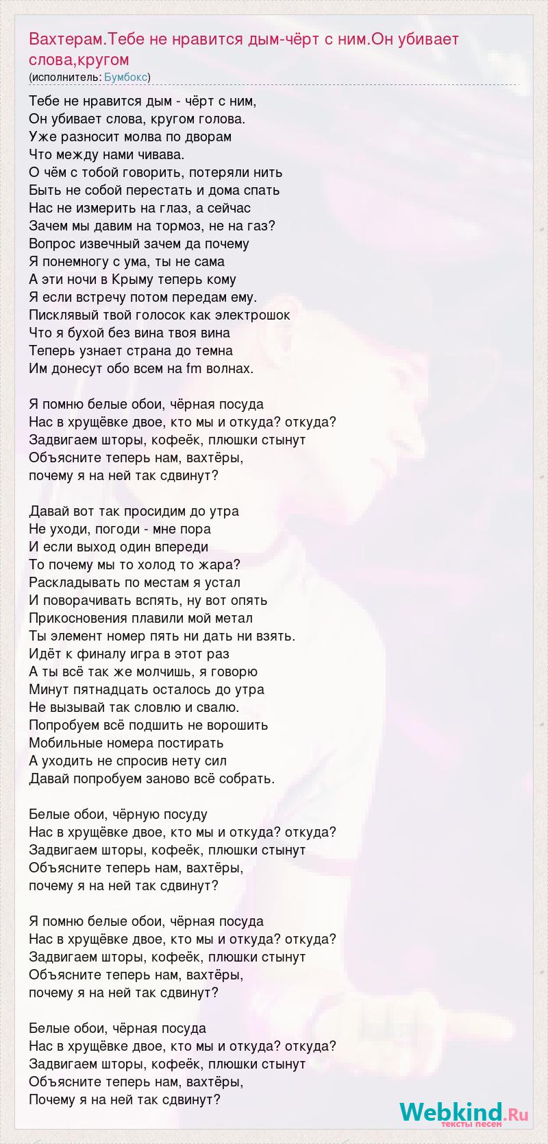 Главная→Исполнители→Бумбокс→Вахтерам.Тебе не нравится дым-чёрт с ним.Он убивает слова,кругом голова.Уже ра
